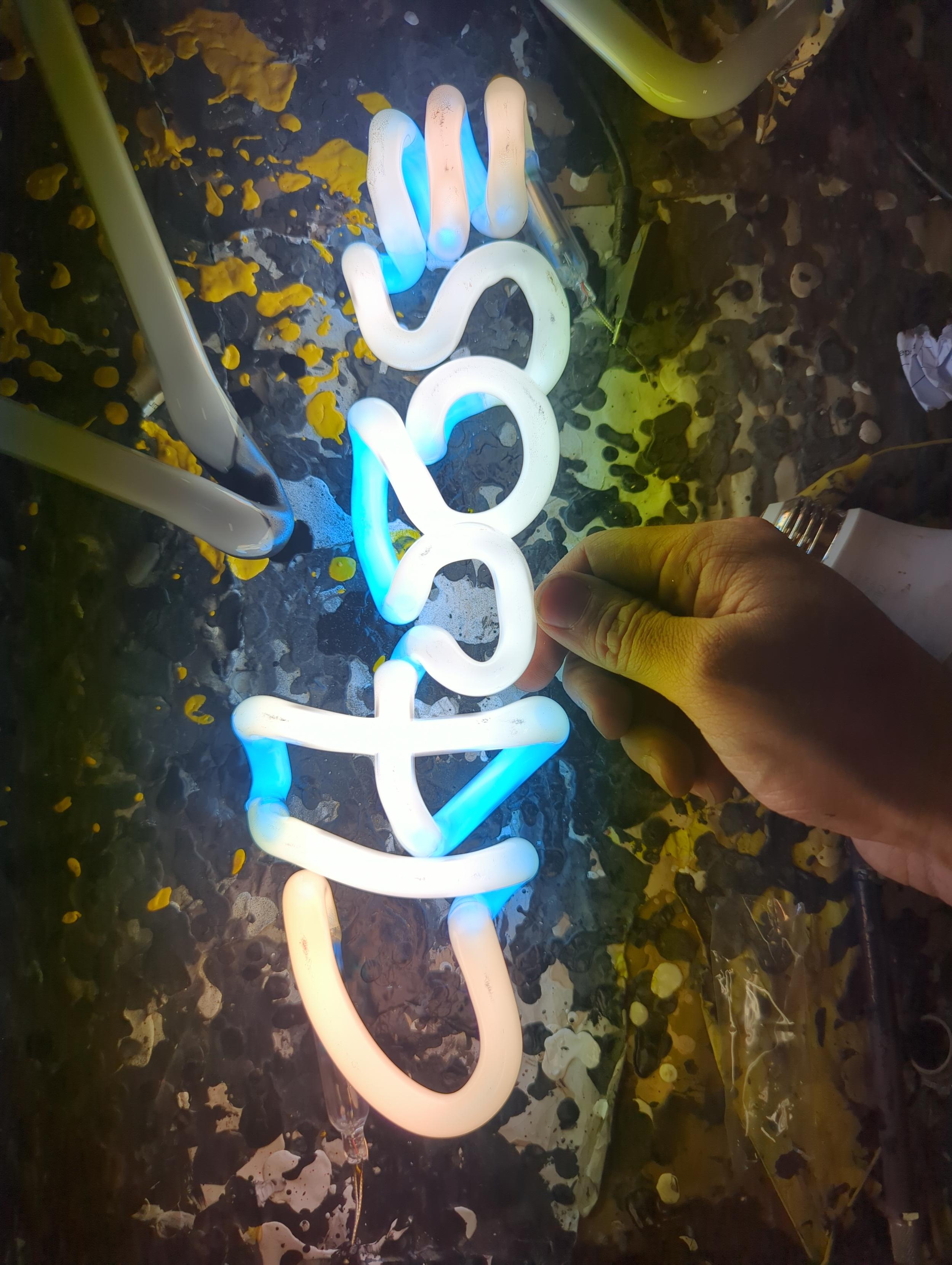 I am gonna be bending neon at Brooklyn Glass's Hot Glass Cold Beer on Saturday. I get most of my neon tubing from there (they import from Italy) and I think this would be nice in a nice warm white and non coated cobalt blue. It took me 1, 3/4 hours to make "CHOOSE" out of scraps I had (whoops, got the whites mixed up 😊 )