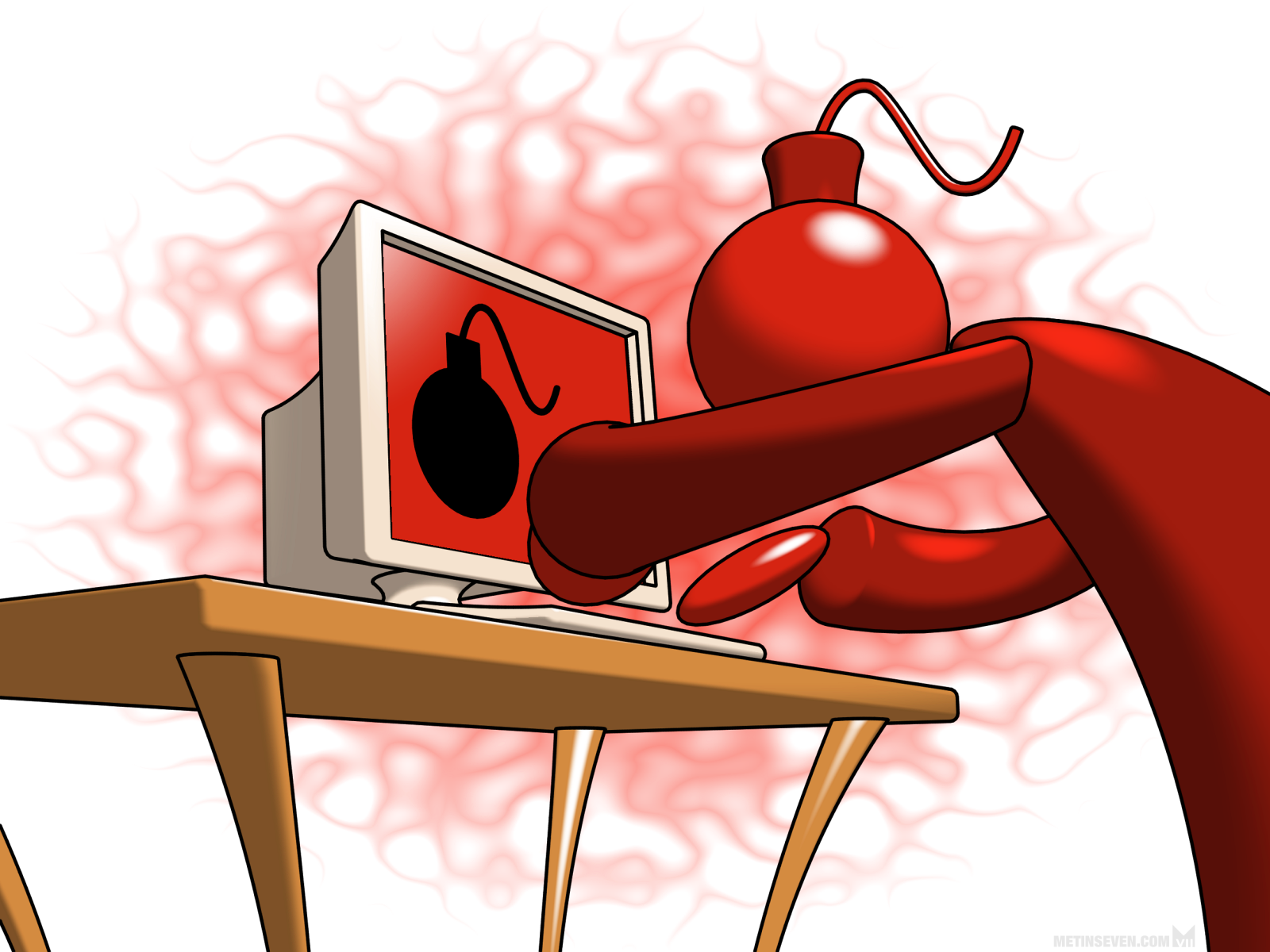 Stylized 3D illustration, showing a virus programmer character with a bomb as a head, standing behind his computer desk. On the desk, his computer screen also shows a bomb.