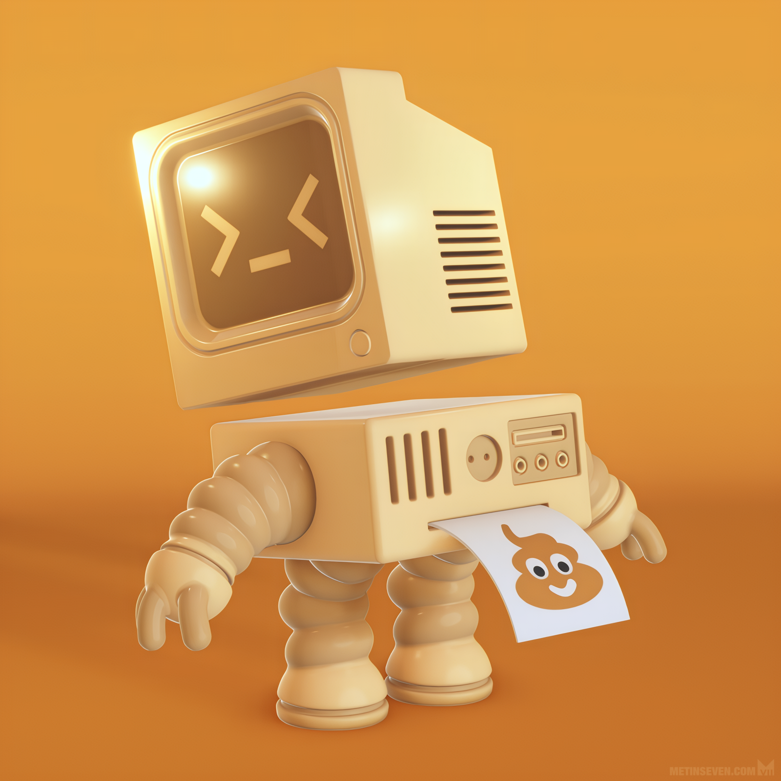 Cartoon-style 3D character resembling an old PC. It prints a poo emoji on a sheet of paper coming out of its backside.