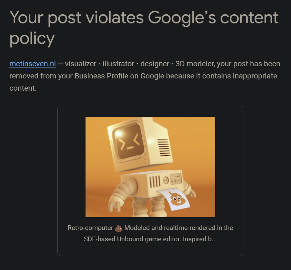 A Google content violation notice, regarding a cartoon-style 3D character resembling an old PC. It prints a poo emoji on a sheet of paper coming out of its backside.