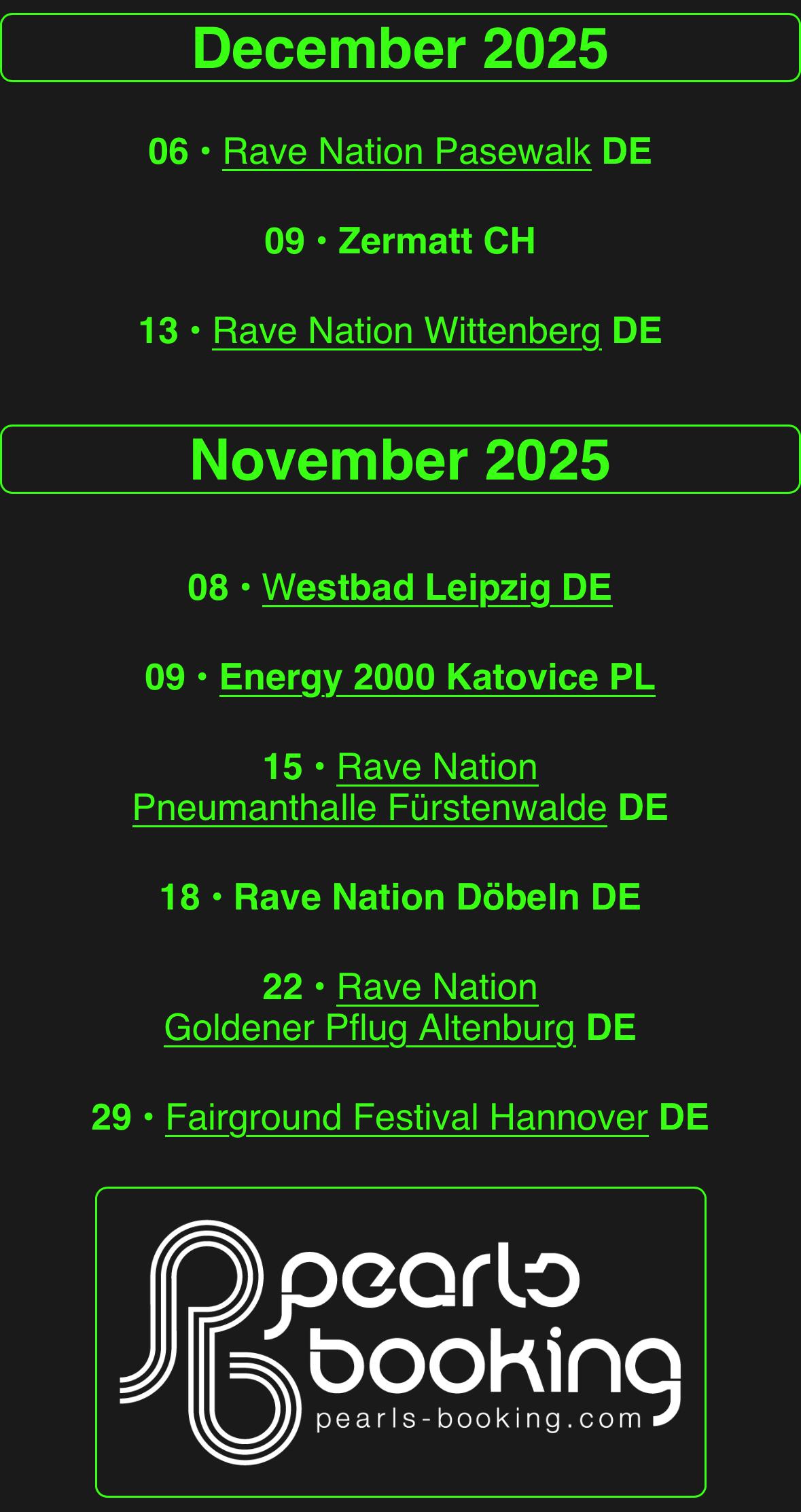Screenshot www.drmotte.de Gigs Termine mit Dr. Motte: - December 2025 06 • Rave Nation Pasewalk DE 09 • Zermatt CH 13 • Rave Nation Wittenberg DE - November 2025 08 • Westbad Leipzig DE 09 • Energy 2000 Katovice PL 15 • Rave Nation Pneumanthalle Fürstenwalde DE 18 • Rave Nation Döbeln DE 22 • Rave Nation Goldener Pflug Altenburg. DE 29 • Fairground Festival Hannover DE pearls-booking.com