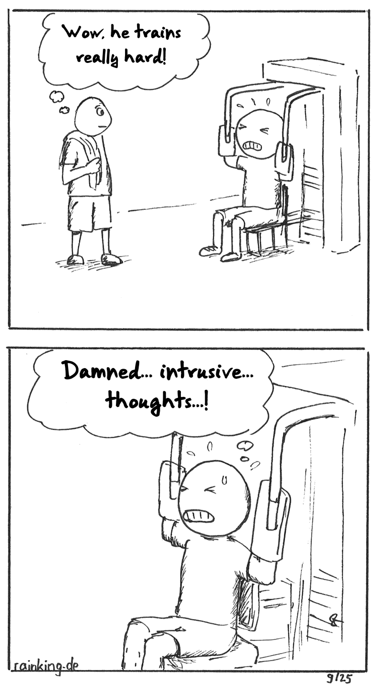 Guy1 in gym, sitting in a machine, training. Clenches teeth, squinting eyes and sweating. Guy2 (thinking): Wow he really trains hard! Guy1 (thinking): Damned intrusive thoughts!