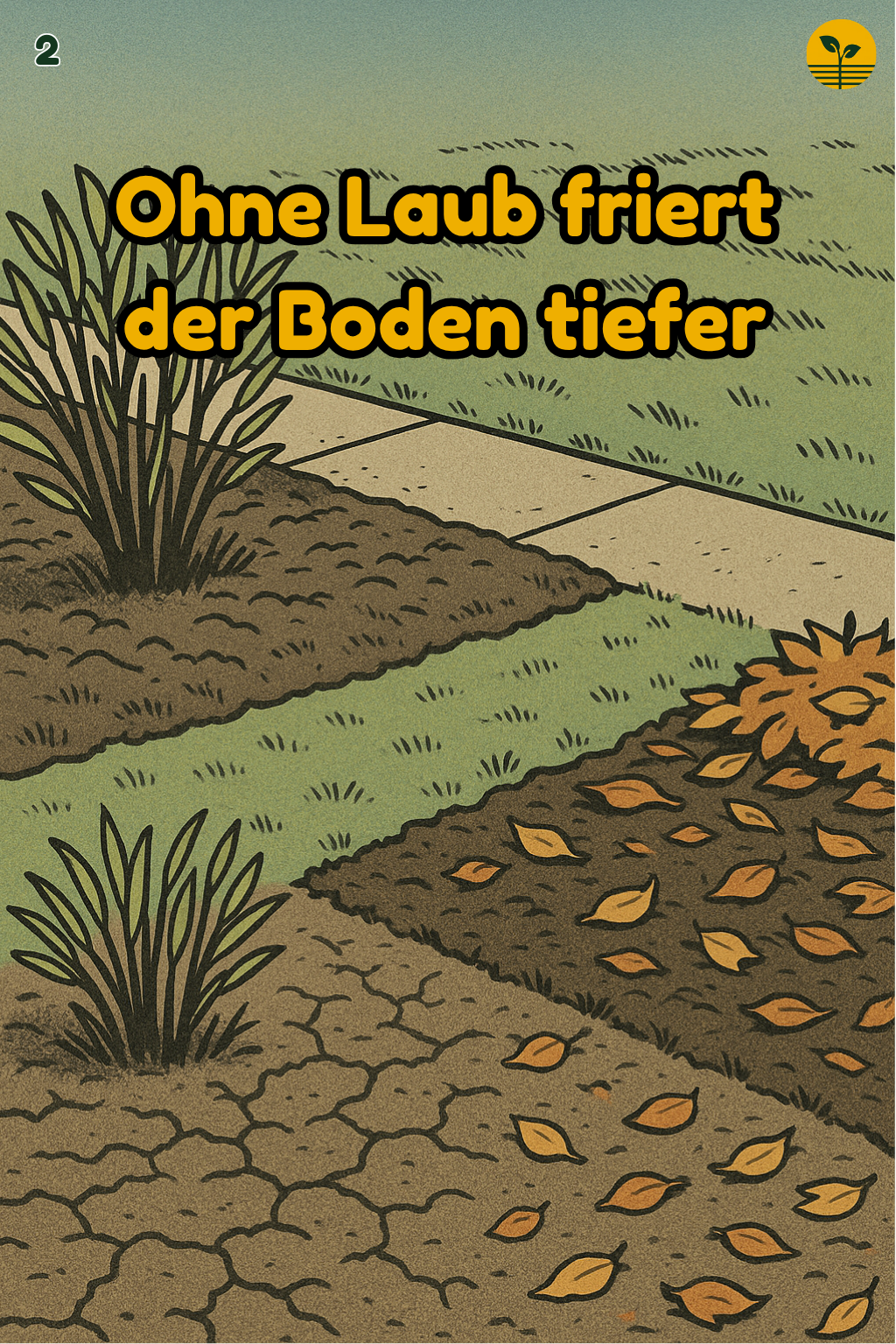 Beet mit rissigem, nacktem Boden neben einem Beet mit dünner Laubschicht, im Hintergrund liegt Reif auf dem Rasen