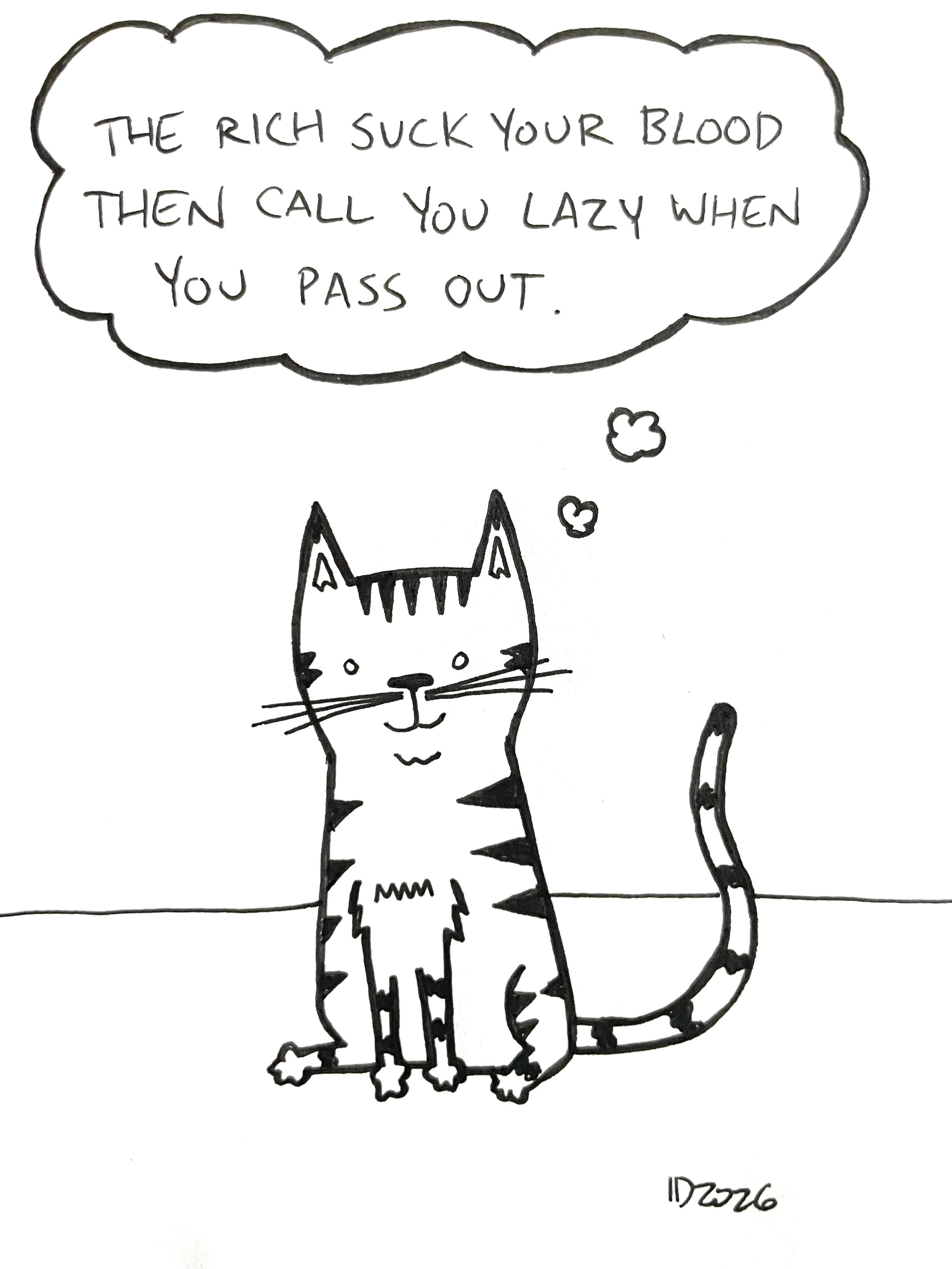 a striped cat sits and thinks "the rich suck your blood then call you lazy when you pass out."