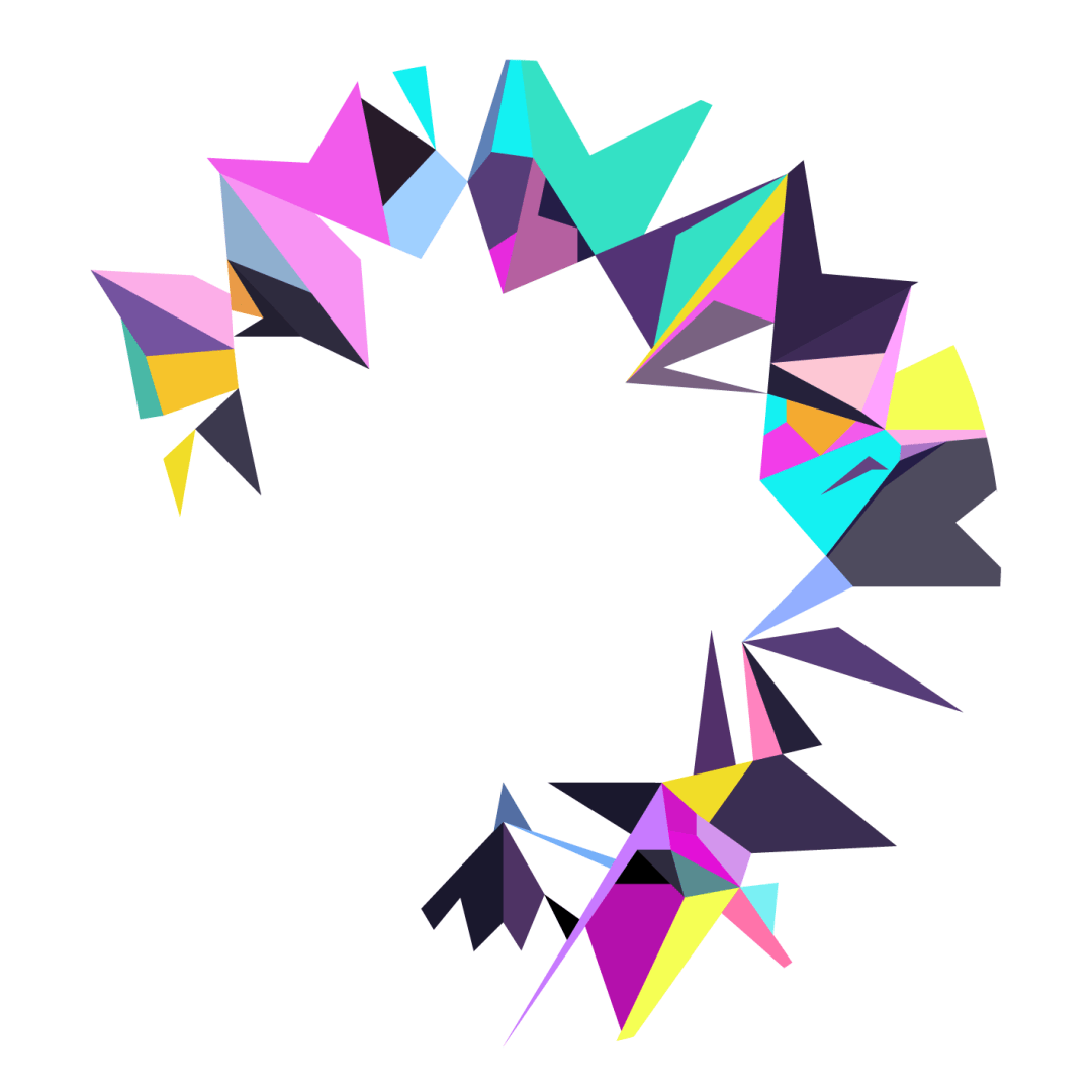 It starts as a small spot and gradually expands into an arc of jagged lines with bright colors of blue, pink, yellow, white, and black.