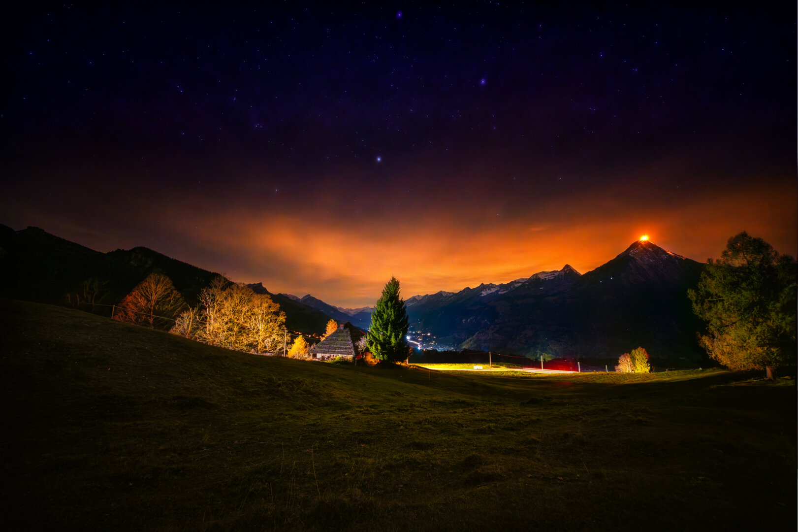 Nachtaufnahme der NIesenkette unter einem sternenklaren Himmel, beleuchtet von fernen Lichtern und einem warmen Horizontglühen. Langzeitbelichtung fängt die Magie der alpinen Nacht ein.