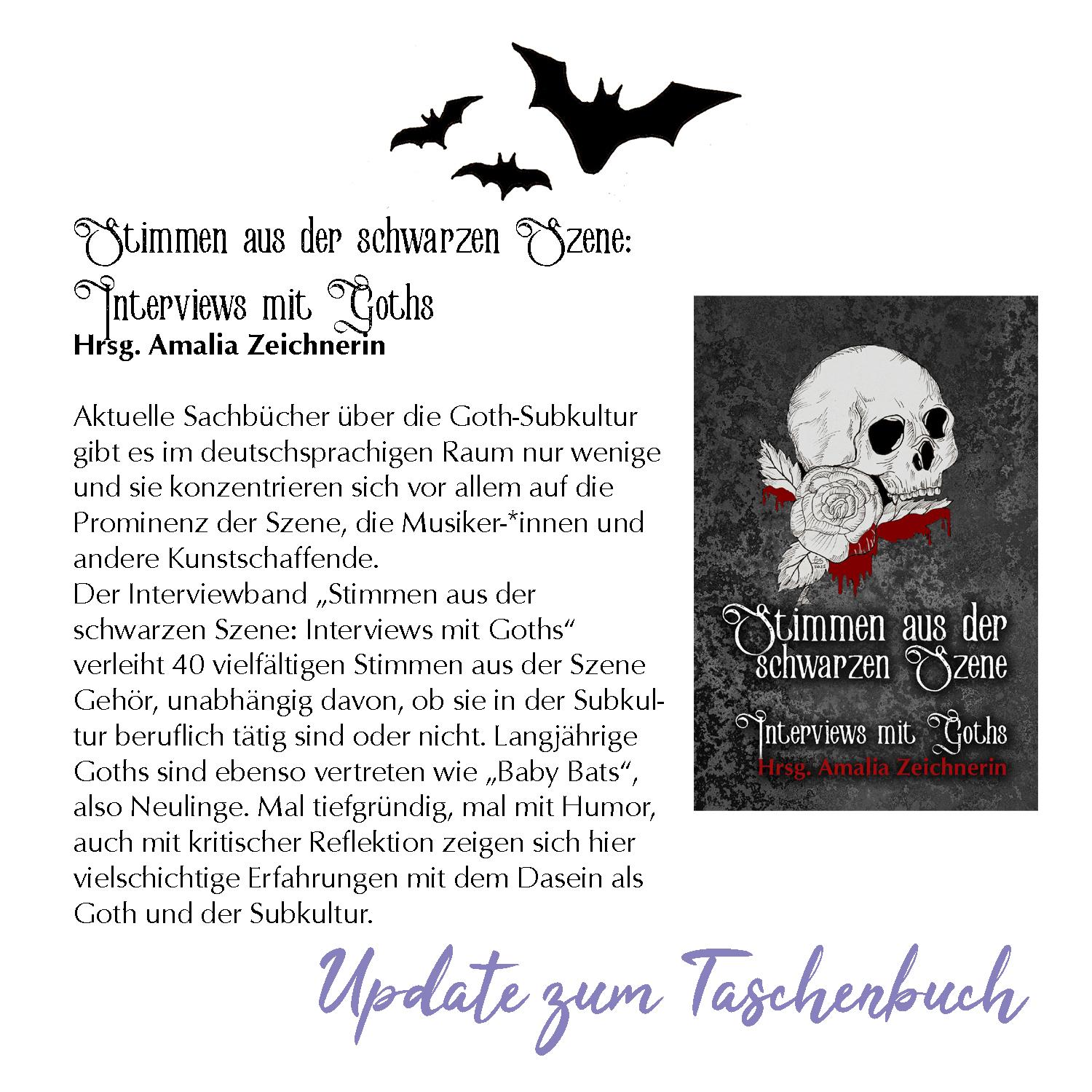 Aktuelle Sachbücher über die Goth-Subkultur gibt es im deutschsprachigen Raum nur wenige und sie konzentrieren sich vor allem auf die Prominenz der Szene, die Musiker*innen und andere Kunstschaffende. Der Interviewband „Stimmen aus der schwarzen Szene: Interviews mit Goths“ aus dem Jahr 2025 verleiht 40 vielfältigen Stimmen aus der Szene Gehör, unabhängig davon, ob sie in der Subkultur beruflich tätig sind oder nicht. Langjährige Goths sind ebenso vertreten wie „Baby Bats“, also Neulinge. Mal tiefgründig, mal mit Humor, auch mit kritischer Reflexion zeigen sich hier vielschichtige Erfahrungen mit dem Dasein als Goth und der Subkultur.