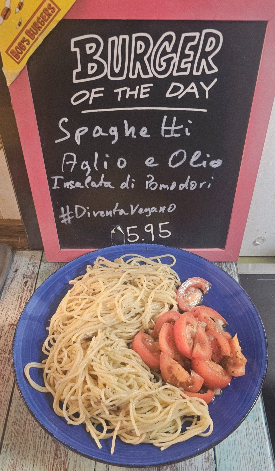il menù di oggi è italiano con spaghetti aglio e olio e insalata di pomodori.