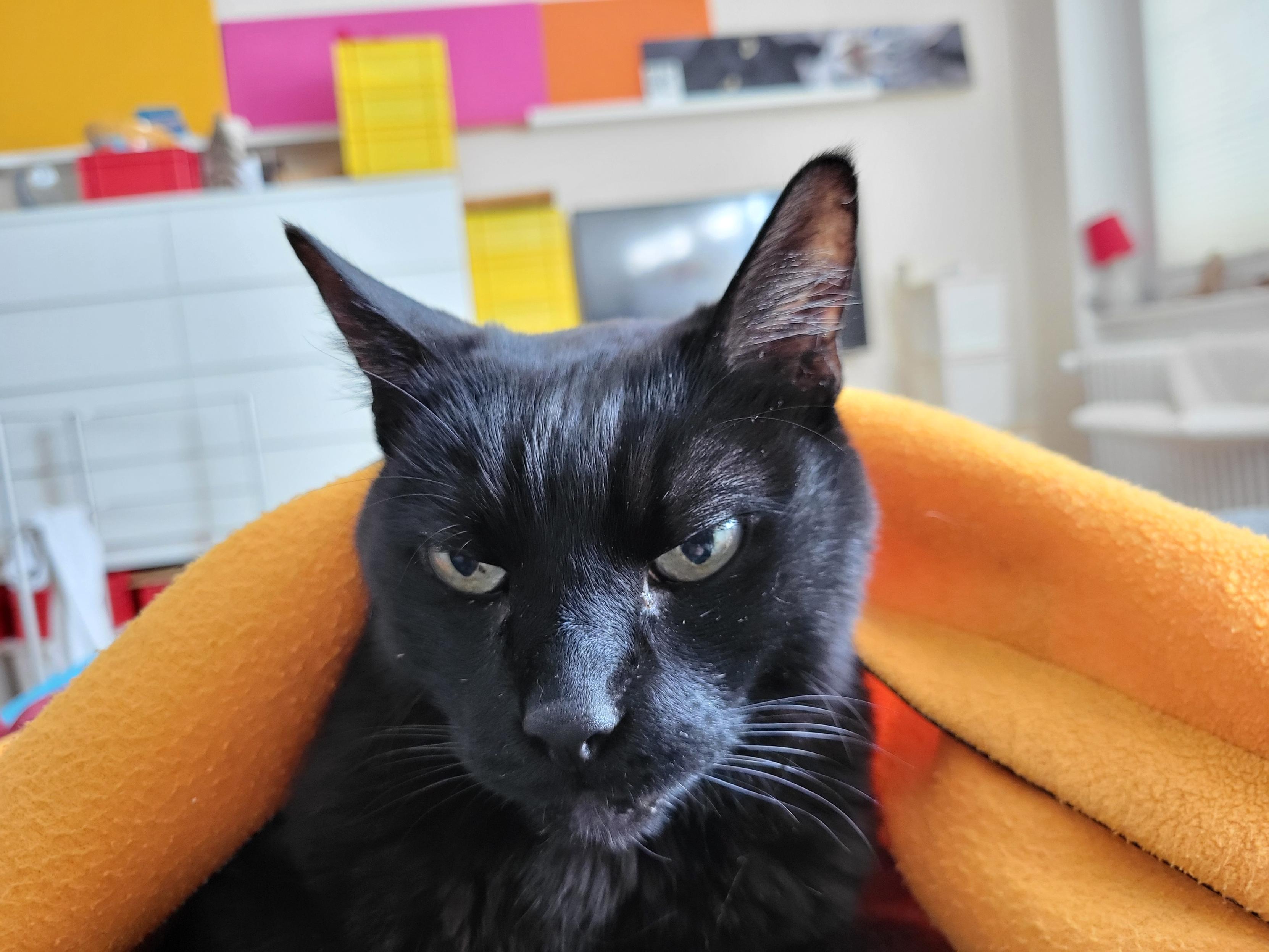 Im Bildvordergrund ein schwarzer Katzenkopf der aus einer orangefarbenen Decke in Bildmitte hervorlugt. Der Gesichtsausdruck mit halbgeschlossenen Augen bei halbgesenktem Kopf wirkt mehrdeutig von wie "Was' los? Störung ungern!" bis schläfrig-lethargisch. Im Bildhintergrund weichgezeichnet helles Interieur in einem Raum mit einzelnen Farbpunkten in rot und gelb.
