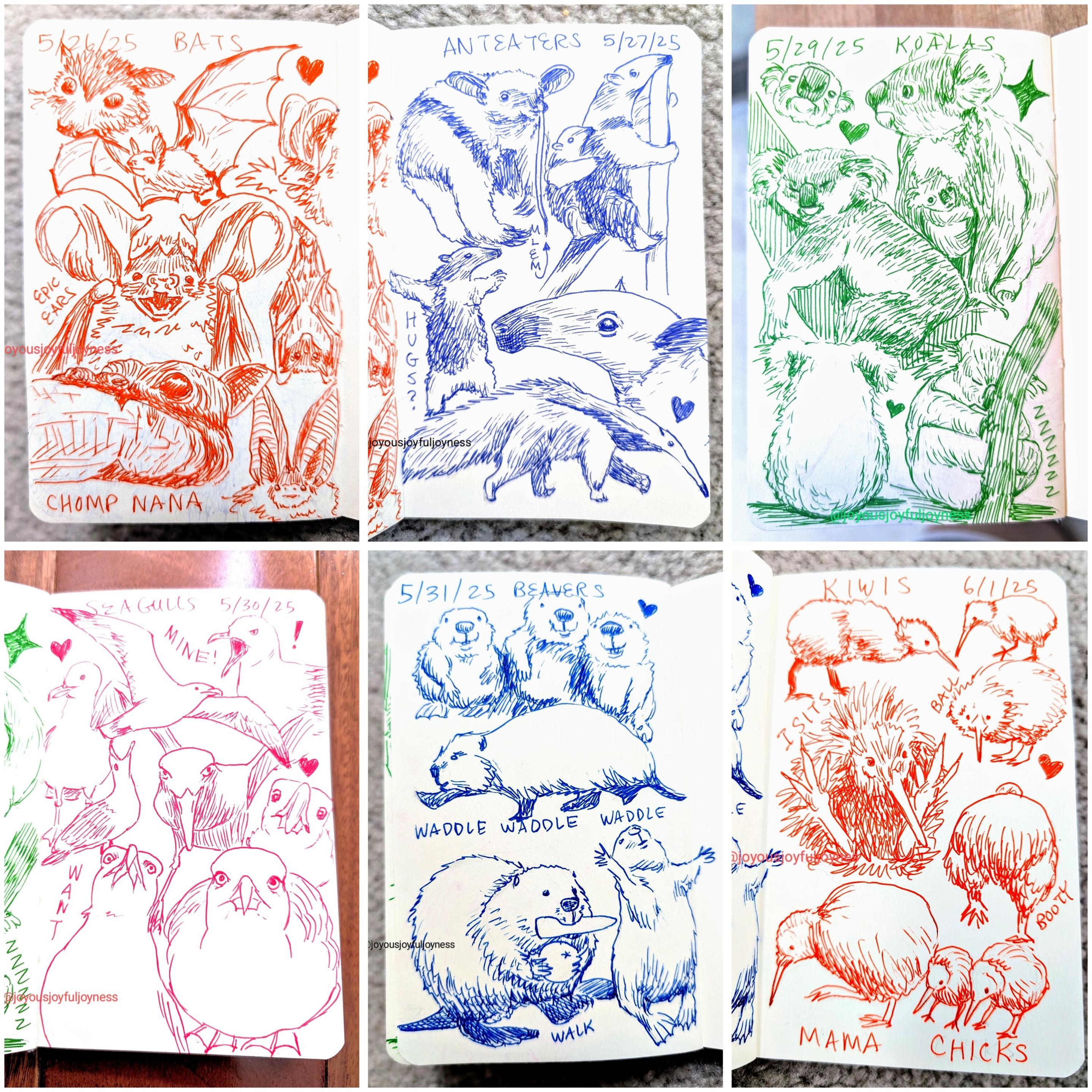 Compilation of 6 photos of sketchbook pages. Top row consists of sketches of bats, anteaters and koalas. Bottom row consists of drawings of seagulls, beavers and kiwi.