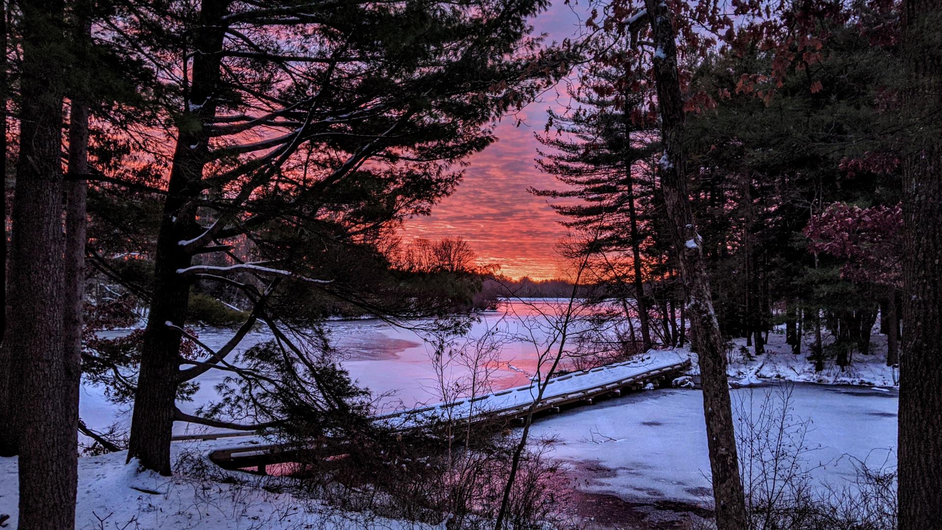 Pink and violet Winter sunrise, Scoville Reservoir, Wolcott, Connecticut. December 6, 2019, 6:53 AM.