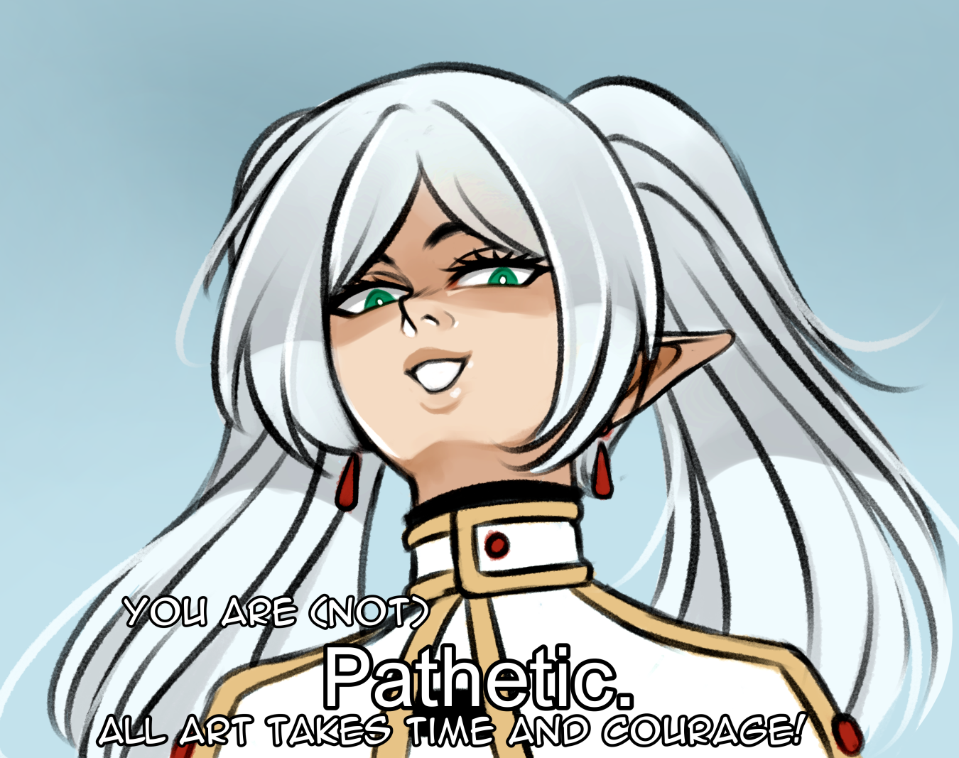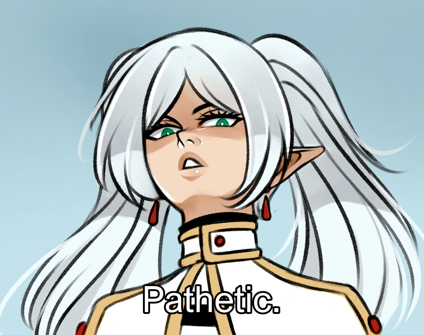The original digital art posted on Reddit that the pixel art is based on, featuring Frieren also looking up while having more realistic proportions, although her chin/jawline is very messed up, making the face look small. u/SpaceDev1 (the original artist) mentions below how they "practiced drawing faces in a different angle, but it looks kinda weird lol"