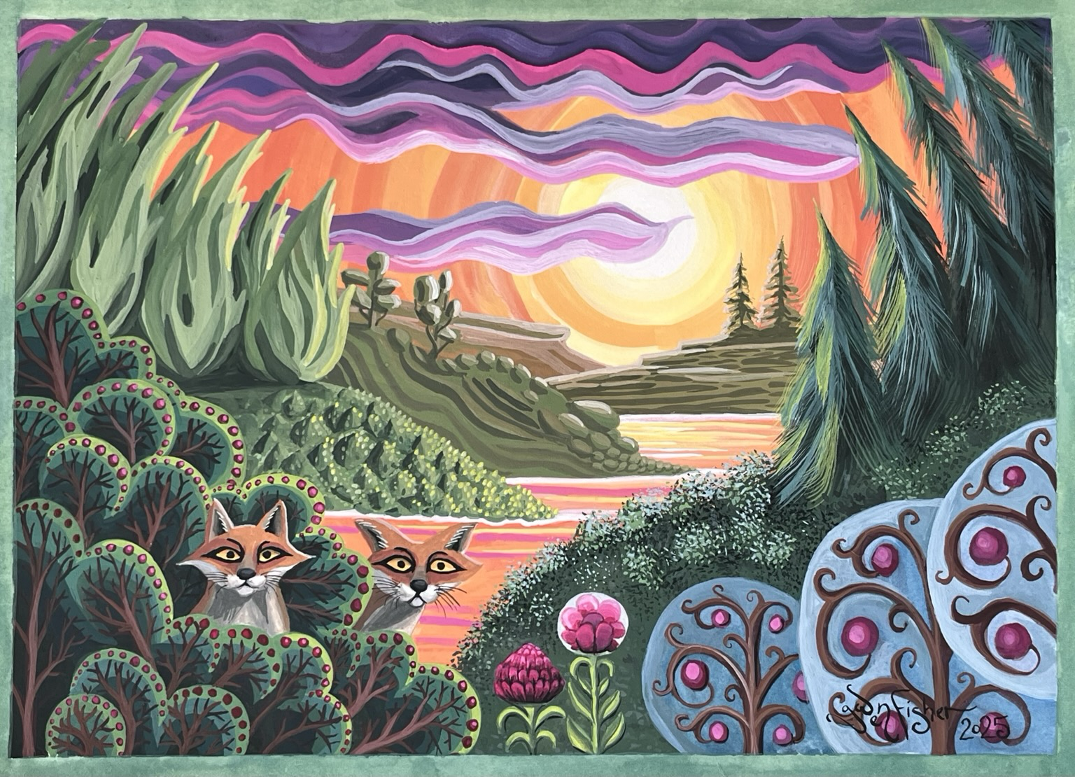 Two Foxes under an Orange Sky