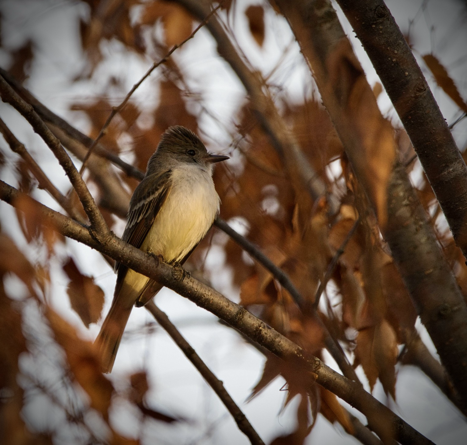 Photo of a fairly large flycatcher, pale overall, crested head, long tail, white throat, and pale yellow belly perched in a tree with rusty orange autumn leaves, taken on November 24, 2023.
