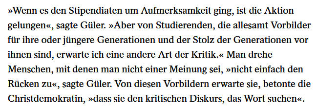 #güler aus der #cdu kritistiert den #protest der #talisman-Stipendiatinnen an #merz, da man im Austausch bleiben müsse und Respekt vor dem Amt haben müsse. So weit, so verständlich.