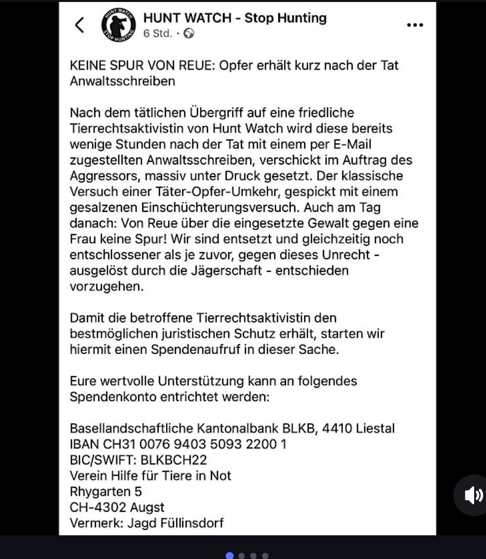 Screenshot KEINE SPUR VON REUE: Opfer erhält kurz nach der Tat Anwaltsschreiben Nach dem tätlichen Übergriff auf eine friedliche Tierrechtsaktivistin von Hunt Watch wird diese bereits wenige Stunden nach der Tat mit einem per E-Mail zugestellten Anwaltsschreiben, verschickt im Auftrag des Aggressors, massiv unter Druck gesetzt. Der klassische Versuch einer Täter-Opfer-Umkehr, gespickt mit einem gesalzenen Einschüchterungsversuch. Auch am Tag danach: Von Reue über die eingesetzte Gewalt gegen eine Frau keine Spur! Wir sind entsetzt und gleichzeitig noch entschlossener als je zuvor, gegen dieses Unrecht -ausgelöst durch die Jägerschaft - entschieden vorzugehen. Damit die betroffene Tierrechtsaktivistin den bestmöglichen juristischen Schutz erhält, starten wir hiermit einen Spendenaufruf in dieser Sache. Eure wertvolle Unterstützung kann an folgendes Spendenkonto entrichtet werden: Basellandschaftliche Kantonalbank BLKB, 4410 Liestal IBAN CH31 0076 9403 5093 2200 1 BIC/SWIFT: BLKBCH22 Verein Hilfe für Tiere in Not Rhygarten 5 CH-4302 Augst