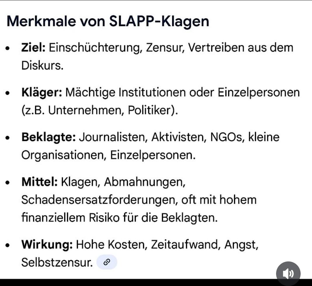 Der Text beschreibt die Merkmale von SLAPP-Klagen (Strategic Lawsuits Against Public Participation). Ziel: Einschüchterung und Zensur. Kläger: Mächtige Institutionen oder Einzelpersonen. Beklagte: Journalisten, Aktivisten, NGOs, kleine Organisationen. Wirkung: Hohe Kosten, Zeitaufwand, Angst und Selbstzensur.