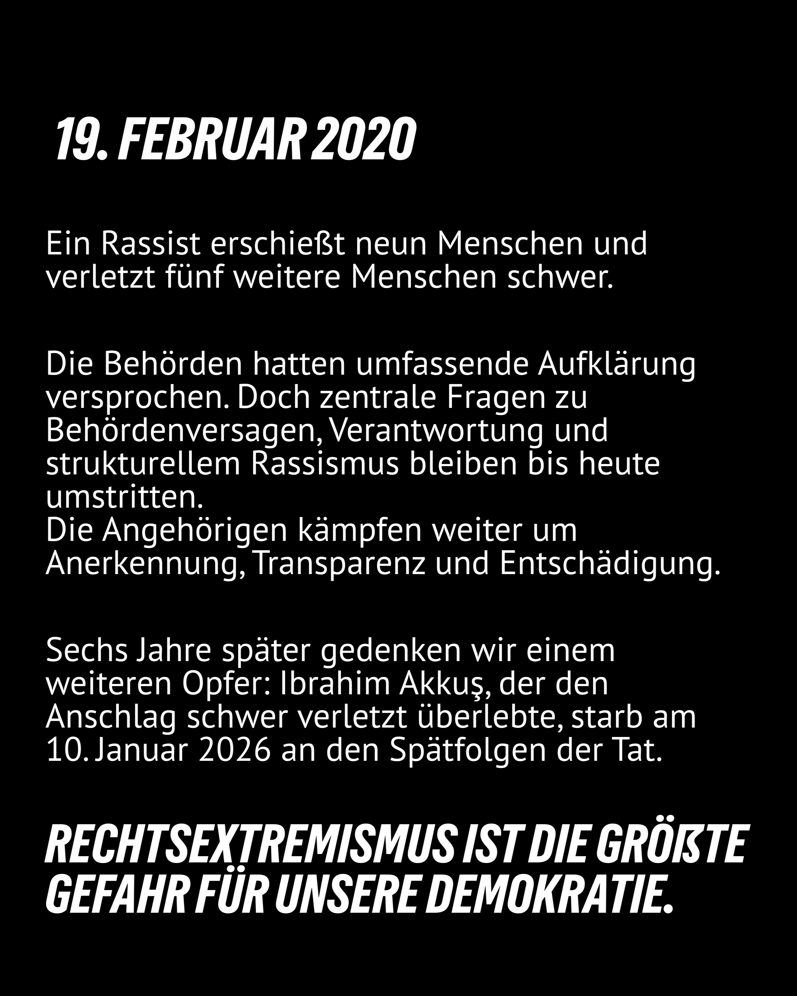 Sechs Jahre später gedenken wir eines weiteren Opfers. Ibrahim Akkuş, der den Anschlag schwer verletzt überlebte, starb am 10. Januar 2026 an den Spätfolgen der Tat.