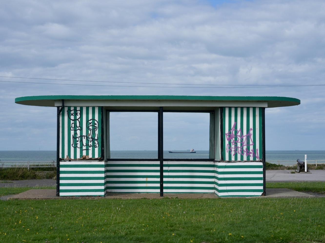 Auf einer Wiese steht ein Warteh盲uschen. In einem Fenster sieht man ein Schiff am Horizont.