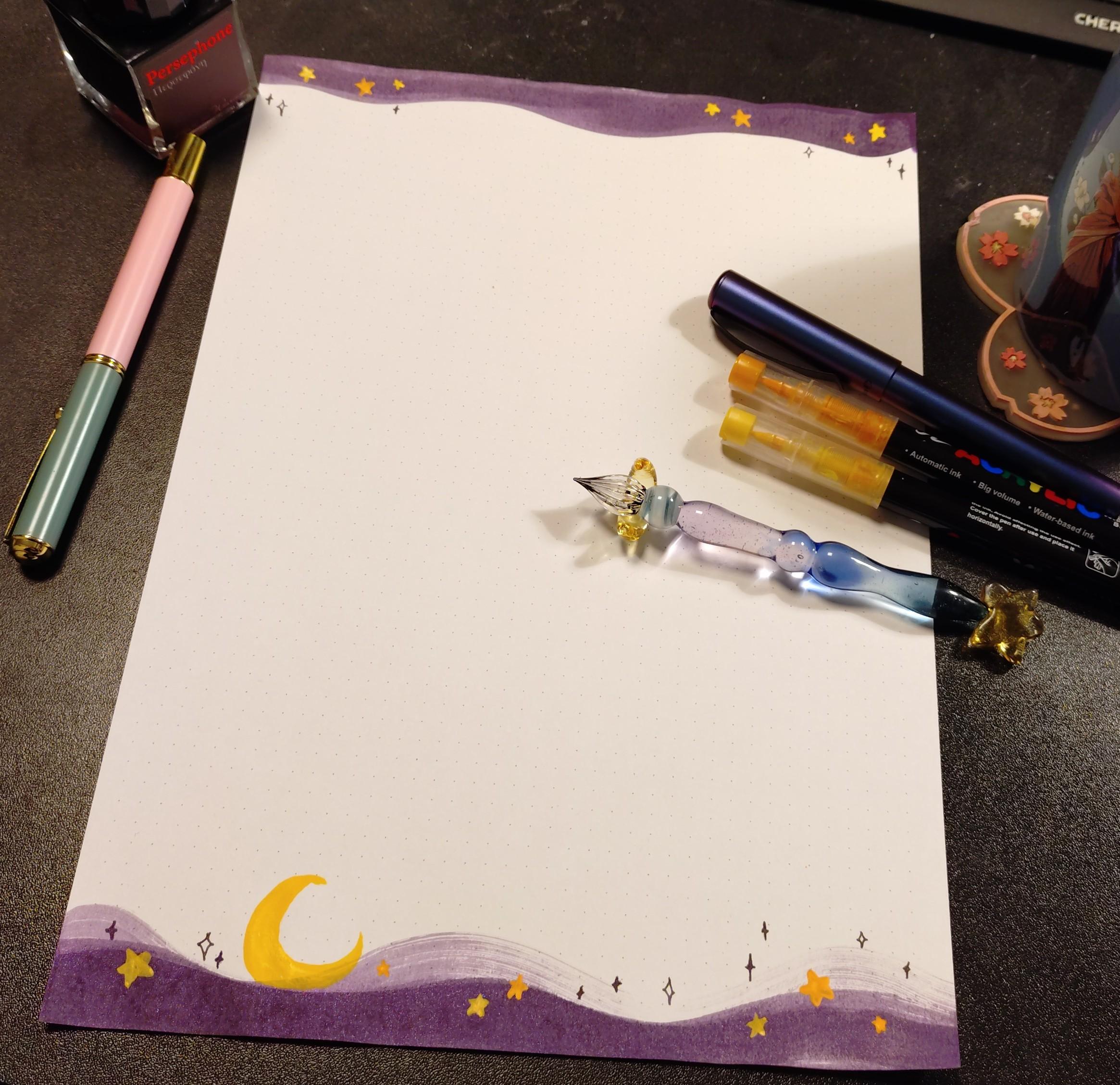 I couldn't find good quality letter paper i liked, so i bought plain ones, printed dot grid on and painted the edges myself. The real world magical girl thing to do is just making shit yourself 馃槑