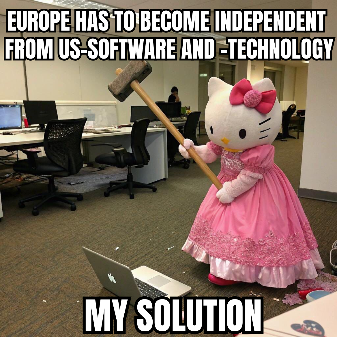 Meme, photo. A person dressed up in a Hello Kitty suit (Pink dress! Plush head with ear ribbon!) in an office holding a big sledgehammer. To their feet is a laptop on the ground (Apple?). Taken somewhere from the internet. Above the person reads: "Europe has to become independent from US-Software and -technology". Below: "My solution".
