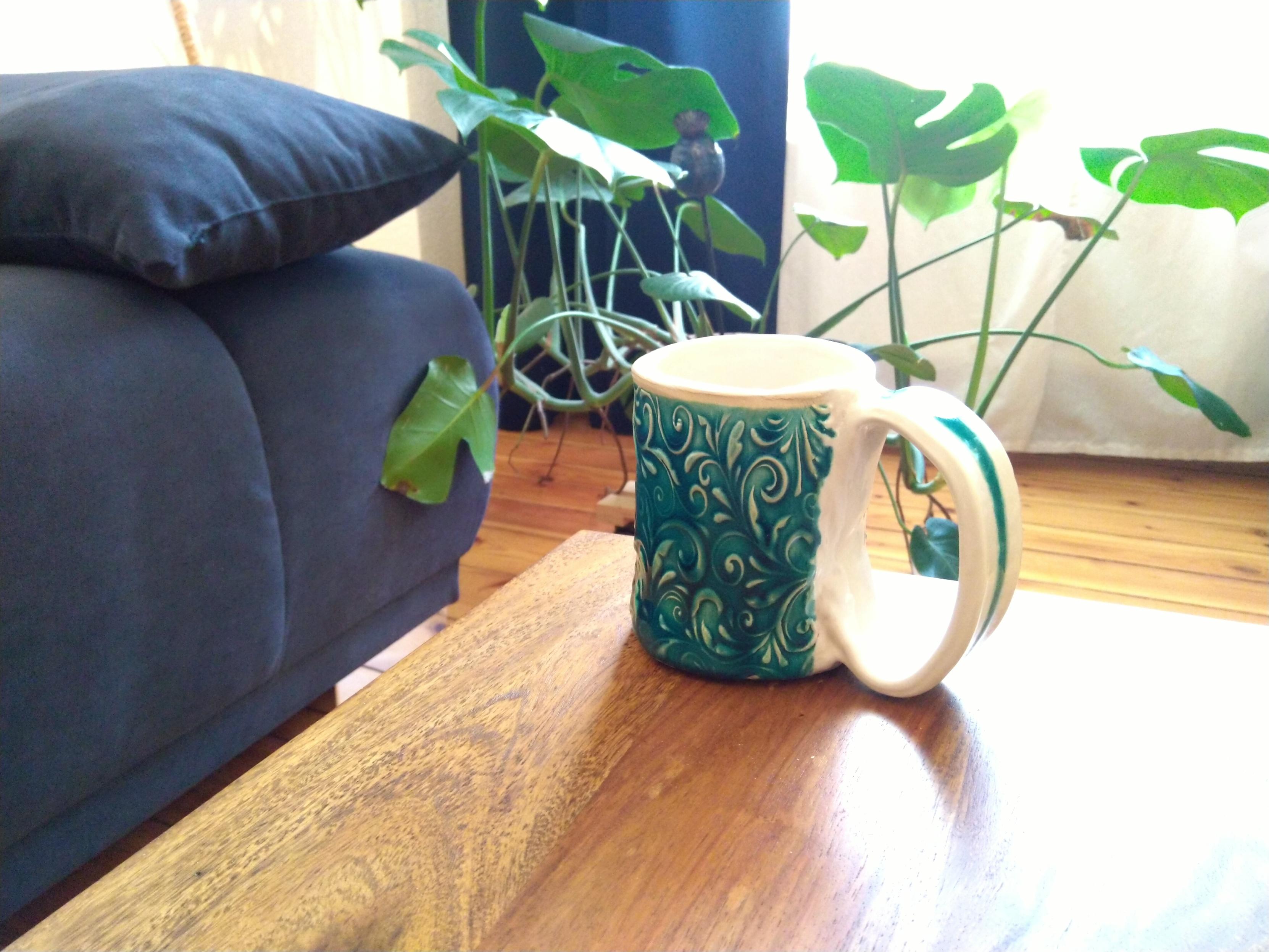 alt Photo of a green and white ceramic mug with an intricate plant pattern on a wooden table. In the background, we see parts of a blue sofa and a green houseplant in front of blue and white curtains. Photo of a green and white ceramic mug with an intricate plant pattern on a wooden table. In the background, we see parts of a blue sofa and a green houseplant in front of blue and white curtains.