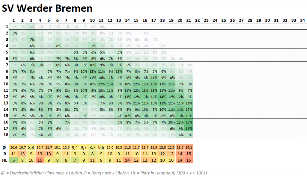 👉 Wahrscheinlichste Platzierung für Bremen ist aktuell Platz 17 (16%), der Schwerpunkt liegt auf den Plätzen 14-17.