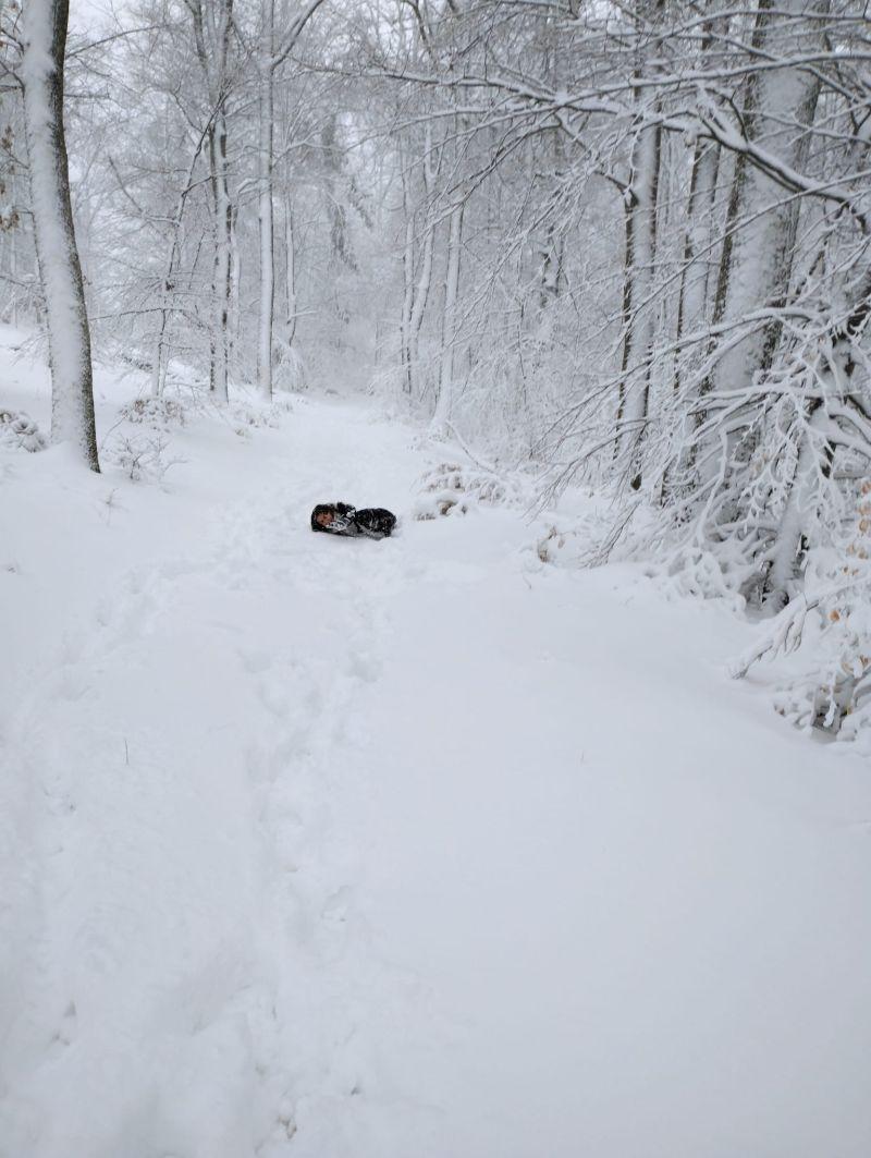 Der Verzweiflung zweiter Teil: Die hier sich aus der Totenstarre erhebende Schneeleiche (Schneeengel post festum) hat sich als meine mir zugemutete Tochter entpuppt, die überraschenderweise (und wider eigenes Erwarten) die 10stündige Internetabstinenz ohne bleibenden Schaden überstanden hat. - Etwa eine Stunde später ging (vorläufig) der Stromausfall zu Ende: Mehr Ekstase, Freude ist kaum vorstellbar. (Papa seufzt ...)