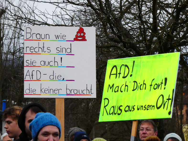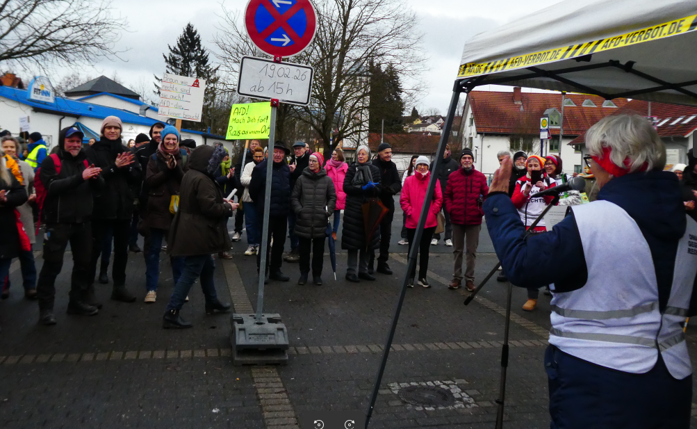 Gestern Demo in Mörlenbach, wo auch eine große AfD-Wahlkampfveranstaltung stattfand (oder auch nicht? Jedenfalls haben wir kaum jemanden in das Bürgerhaus hineingehen sehen.). Eine Freundin schätzt 130 Teilnehmende – auf die Schnelle nicht wenig!