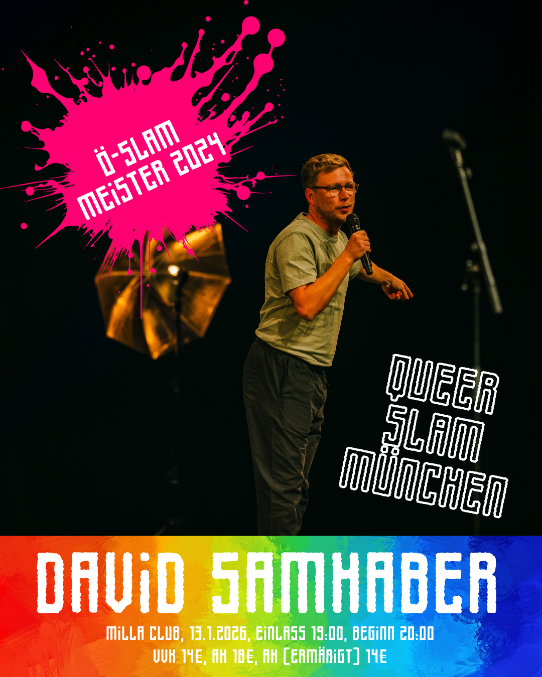 Ein Mann mit graugrünem T-Shirt und dunkler Hose hält ein Mikrofon in der Hand. Der Hintergrund ist schwarz. Man erkennt Teile einer Bühne anhand von Lampe und Mikrofonständer. Auf einem pinken Farbklecks steht "Ö-Slam Meister 2024. In einer Ecke ist das Logo "Queer Slam München". Am unteren Bildrand steht auf einem Regenbogen Banner "David Samhaber" und klein darunter "Milla Club, 13.1.2026, Einlass 19:00, Beginn 20:00 VVK 14€, AK 18€, AK (ermäßigt) 14€"