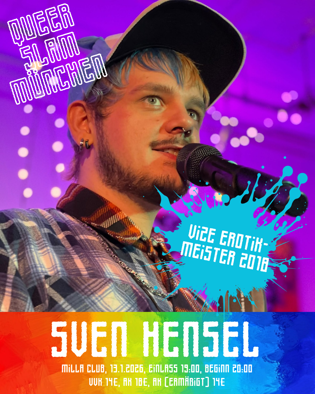 Ein Mann mit kariertem Hemd, Bart und einer Cap steht vor einem Mikrofon. Der Hintergrund ein lila beleuchteter Raum. Auf einem blauen Farbklecks steht "Vize Erotikmeister 2018". In einer Ecke ist das Logo "Queer Slam München". Am unteren Bildrand steht auf einem Regenbogen Banner "Sven Heneel" und klein darunter "Milla Club, 13.1.2026, Einlass 19:00, Beginn 20:00 VVK 14€, AK 18€, AK (ermäßigt) 14€"