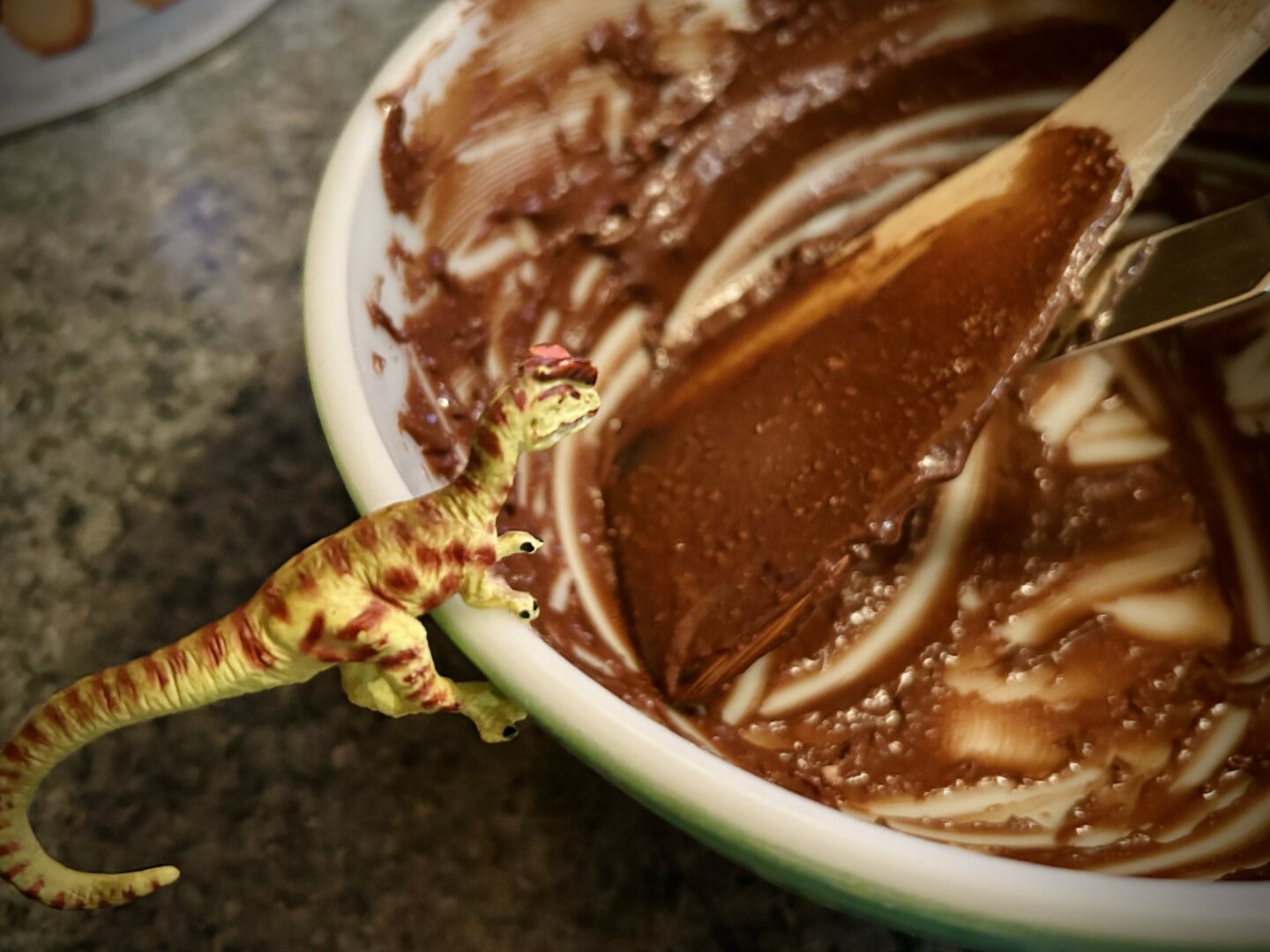 Dilophosaurus licks the batter leftover from some Christmas brownies.