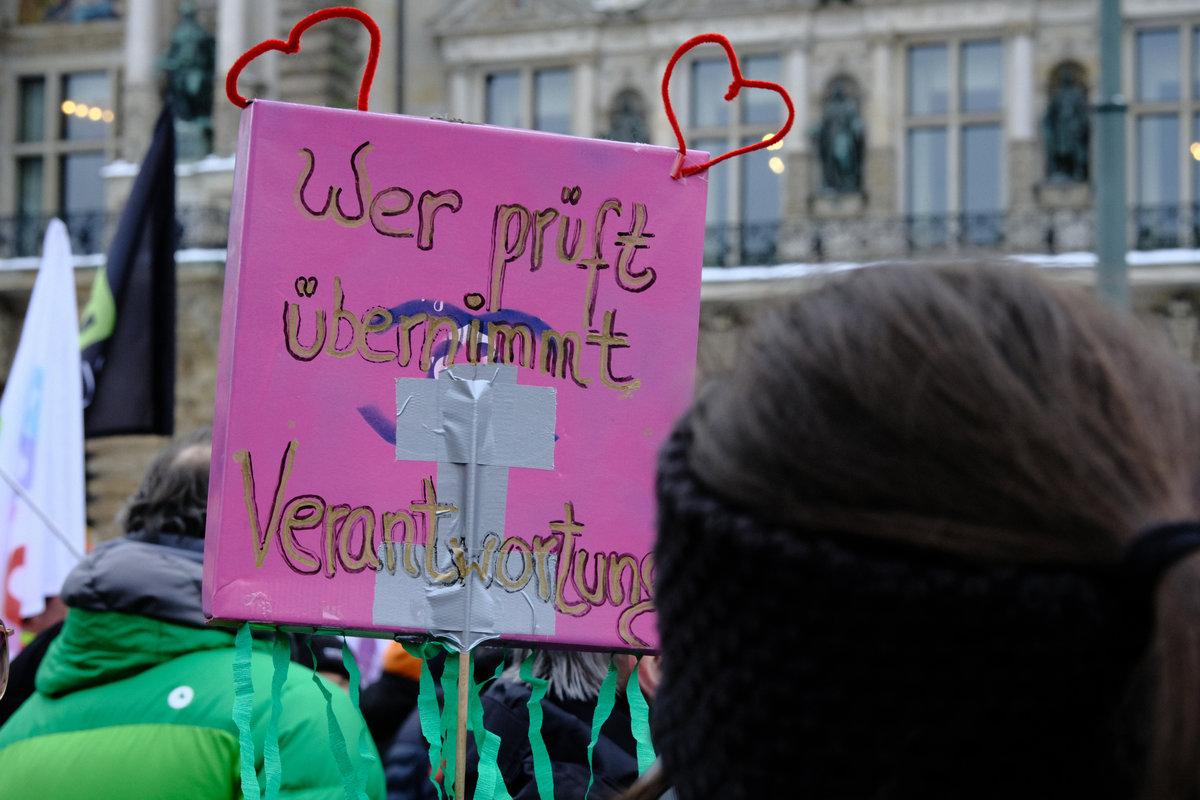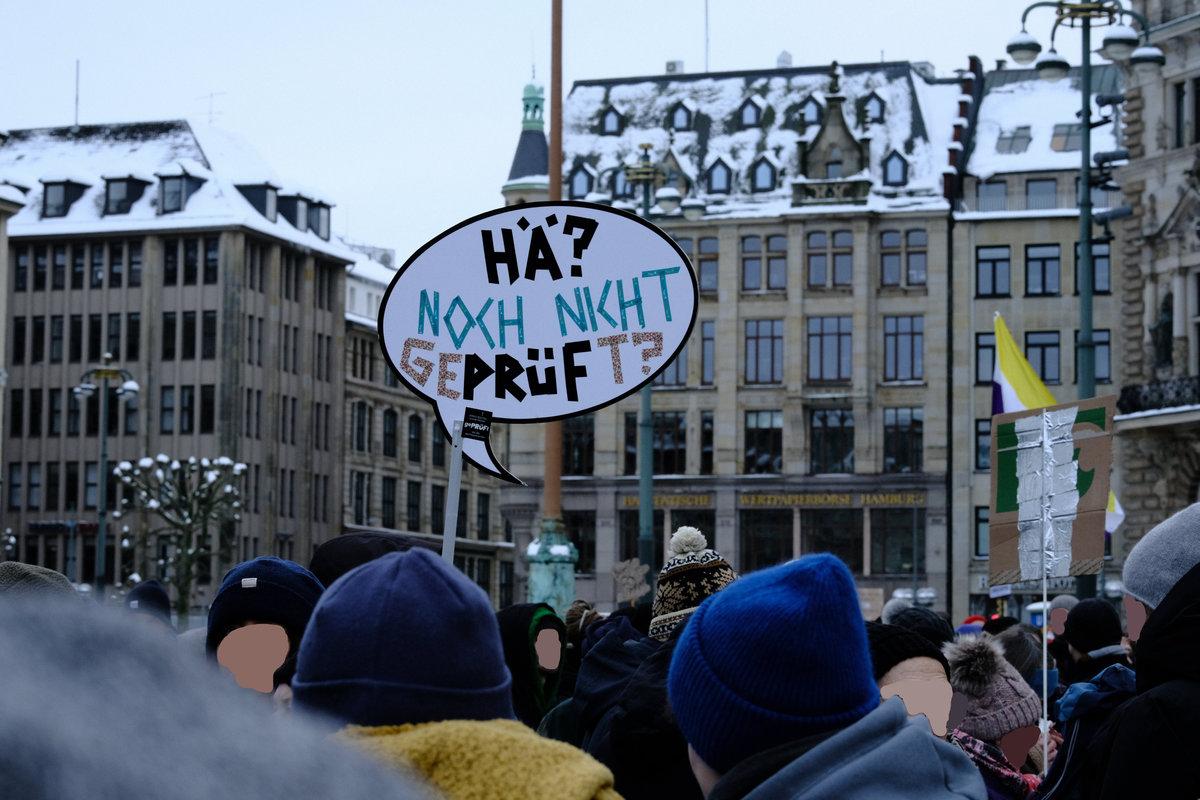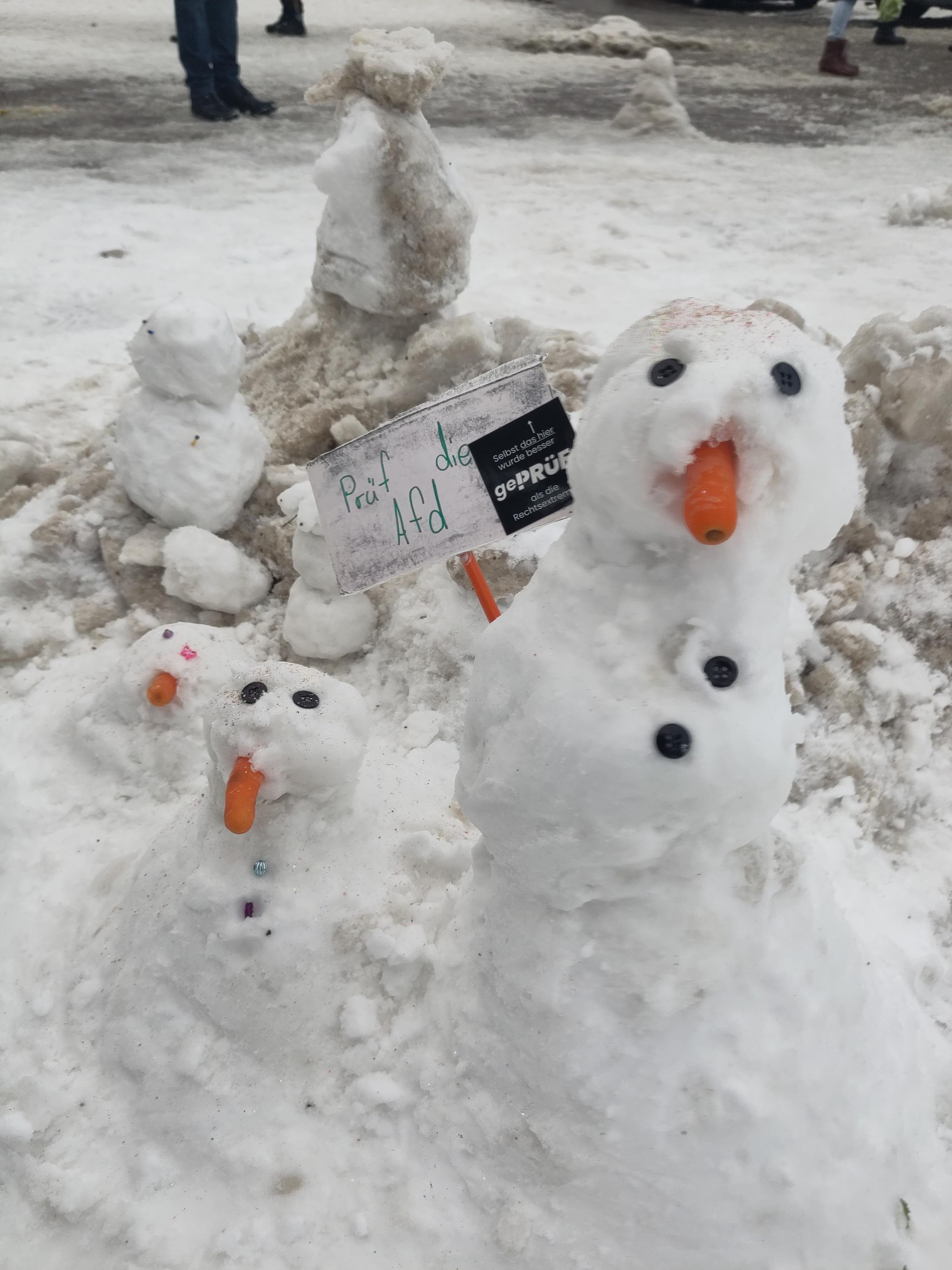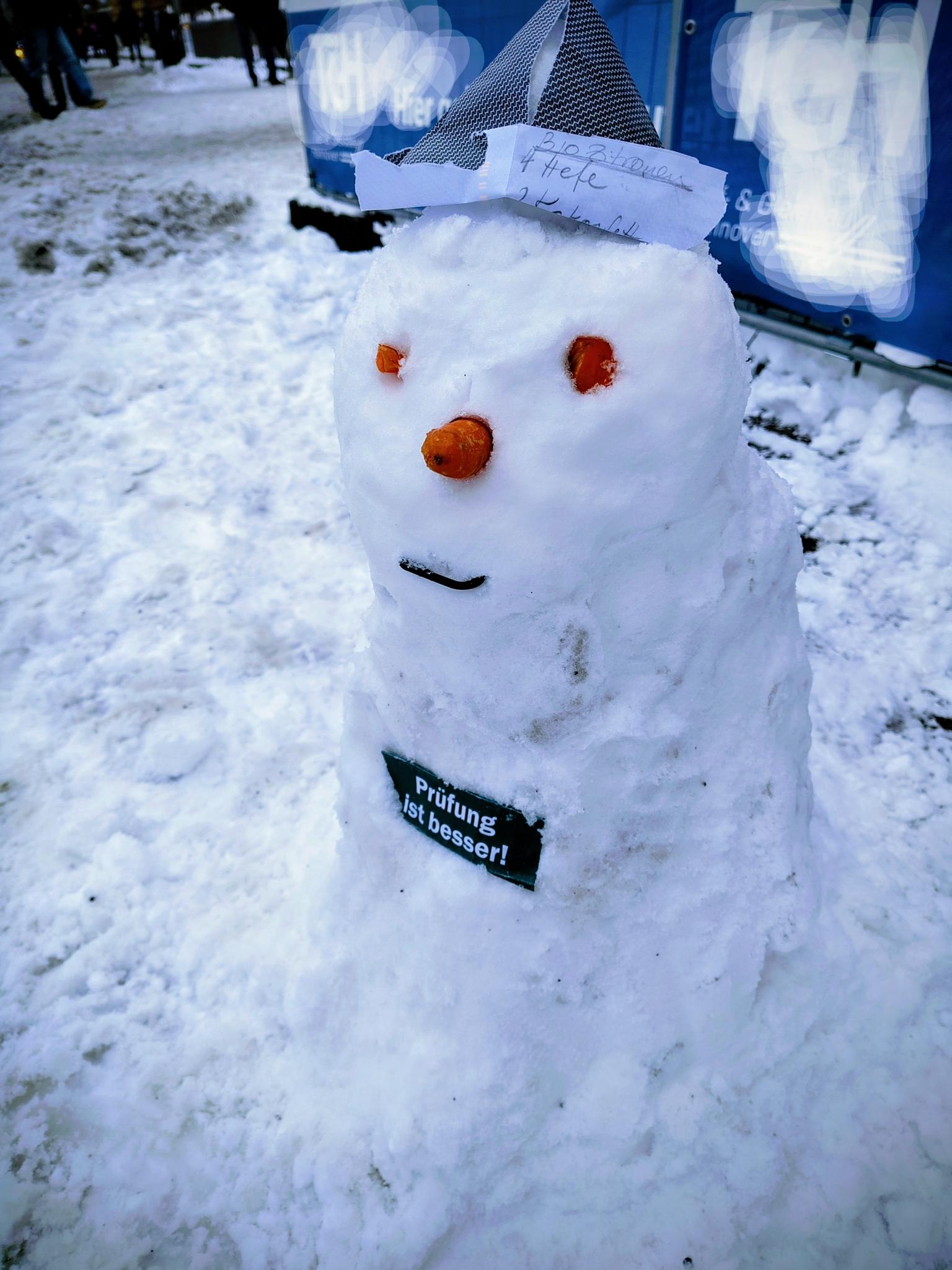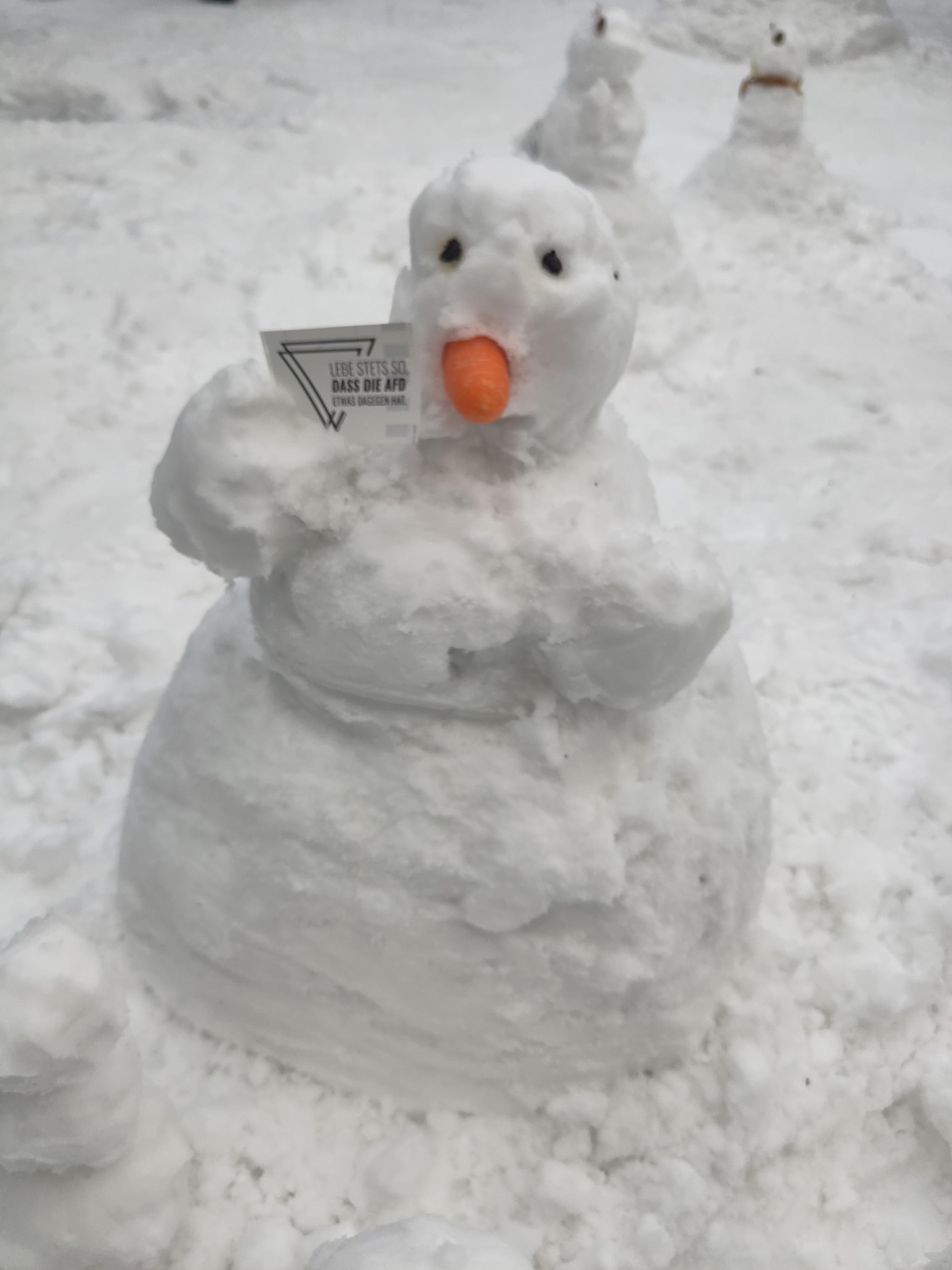einer von hunderten Schneemenschen, die vor dem Rathaus Hamburg stehen und eine Prüfung durch das Bundesverfassungsgericht fordern. Der Schneemensch hält zwei Schilder.