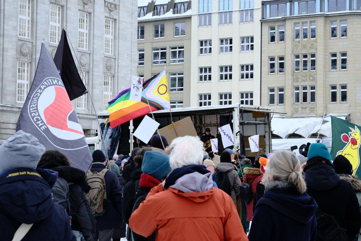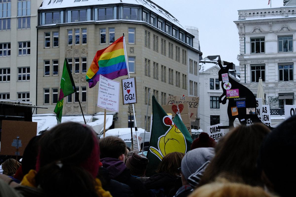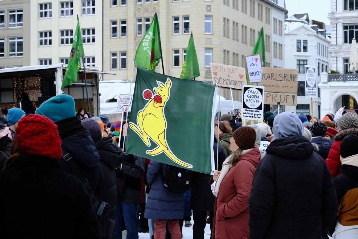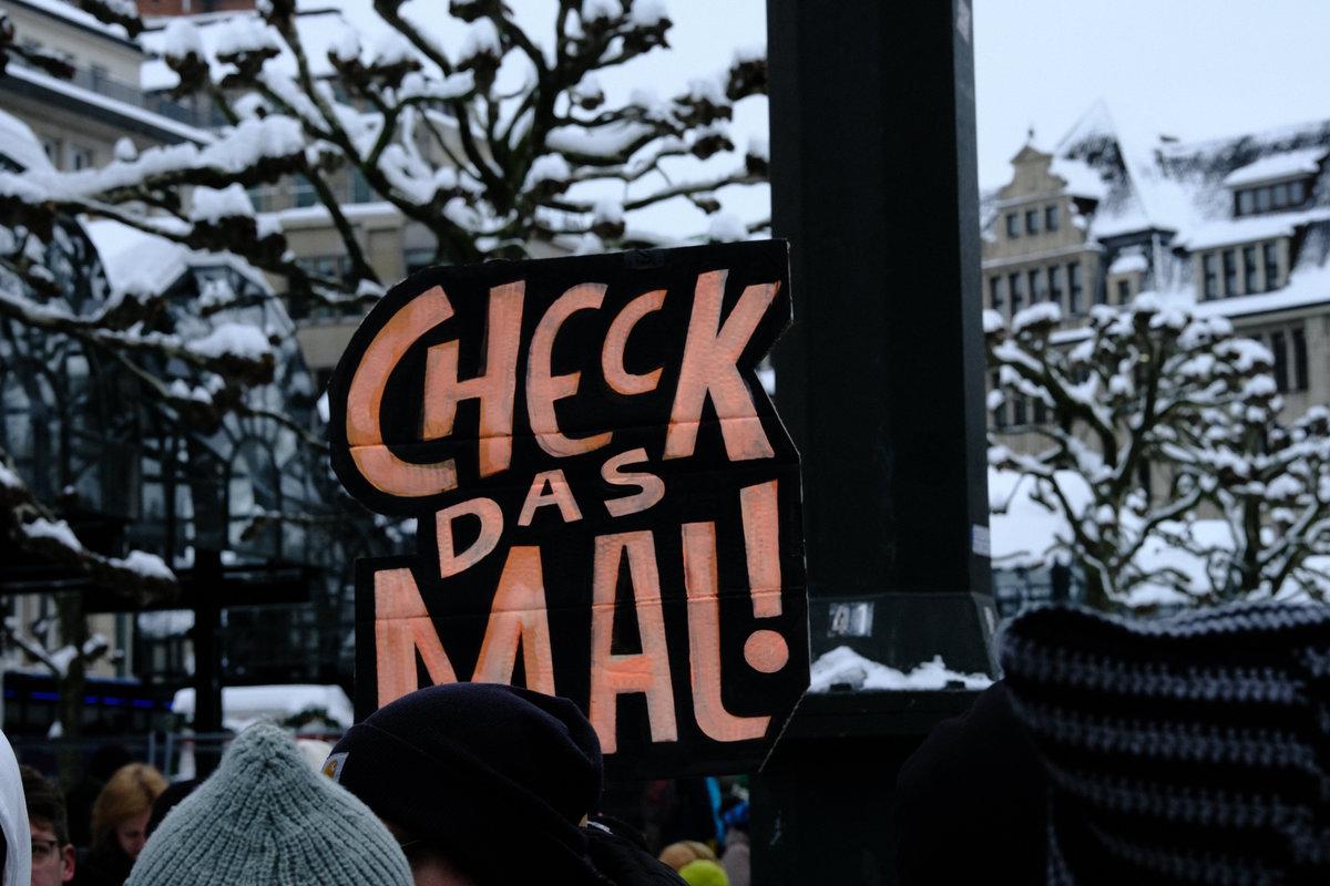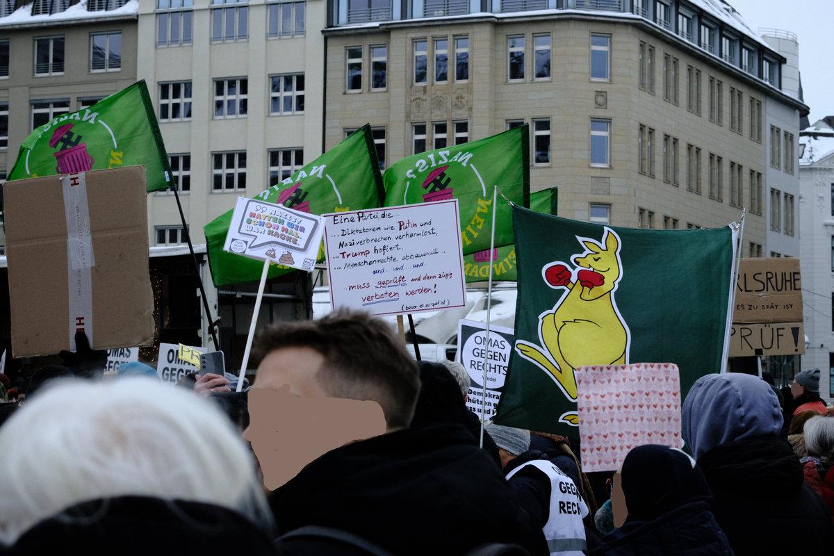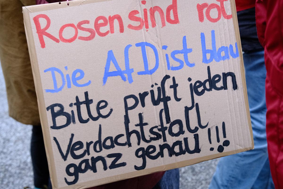 Schild 2: „Alle Parteien, die vom Verfassungsschutz als rechtsextremer Verdachtsfall oder als gesichert rechtsextrem eingestuft werden, sollen vom Bundesverfassungsgericht überprüft werden, bitte!“