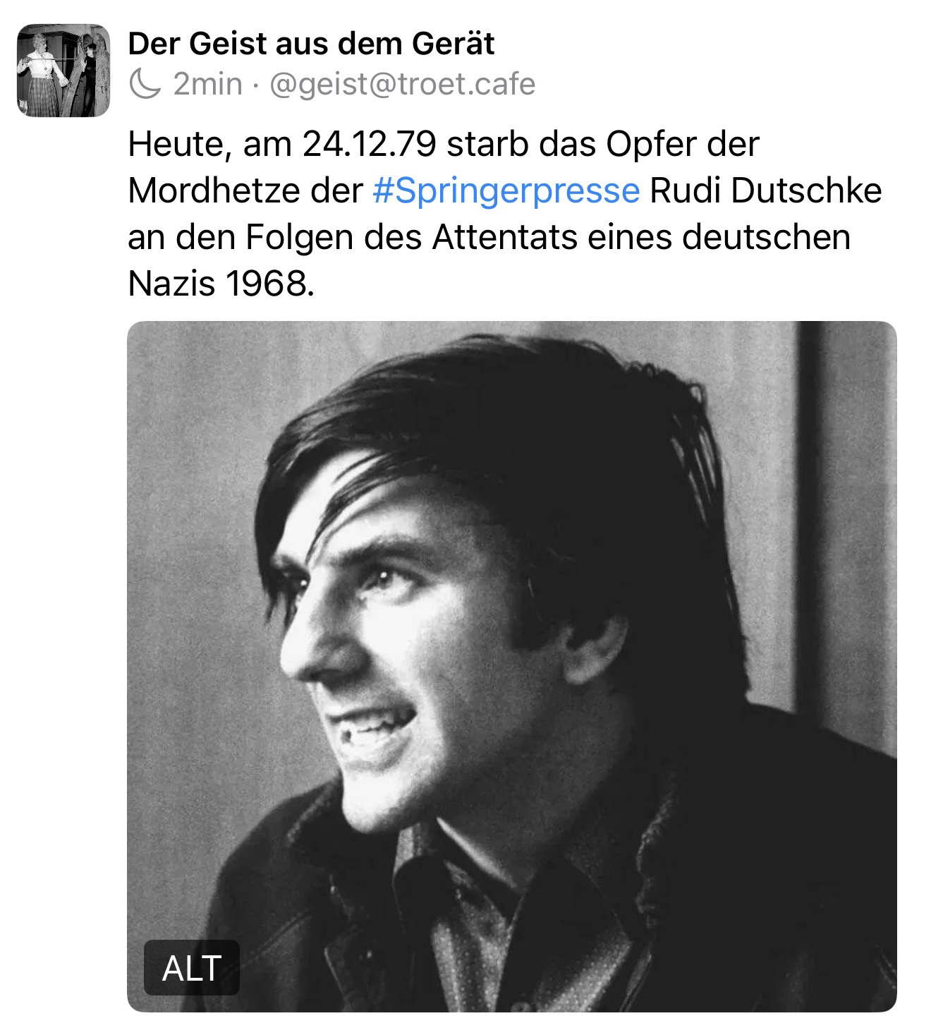 #RudiDutschke #INFJ #RIP Sir … Rudi starb am 24.12.1979 an den Spätfolgen eines Attentats, doch seine Idee von #Aufklärung, #Verantwortung und #geistigerFreiheit überlebte die Gewalt. #Dutschke steht für den #Mut, … #Systeme zu hinterfragen, wenn sie Menschen verformen. Heute gerade wichtig! 🖖