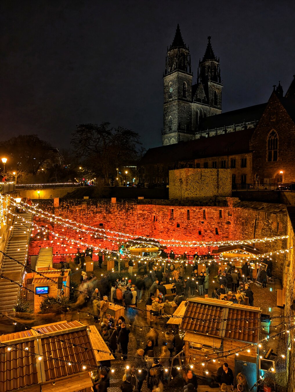 As promised, here are some #Christmas lights from #Magdeburg. This is a small #ChristmasMarket at Bastion Cleve (once part of the city's fortifications) with a view of #MagdeburgCathedral. It's part of the "Winter Garden", organized by the Schweizer Milchkuranstalt beer garden.