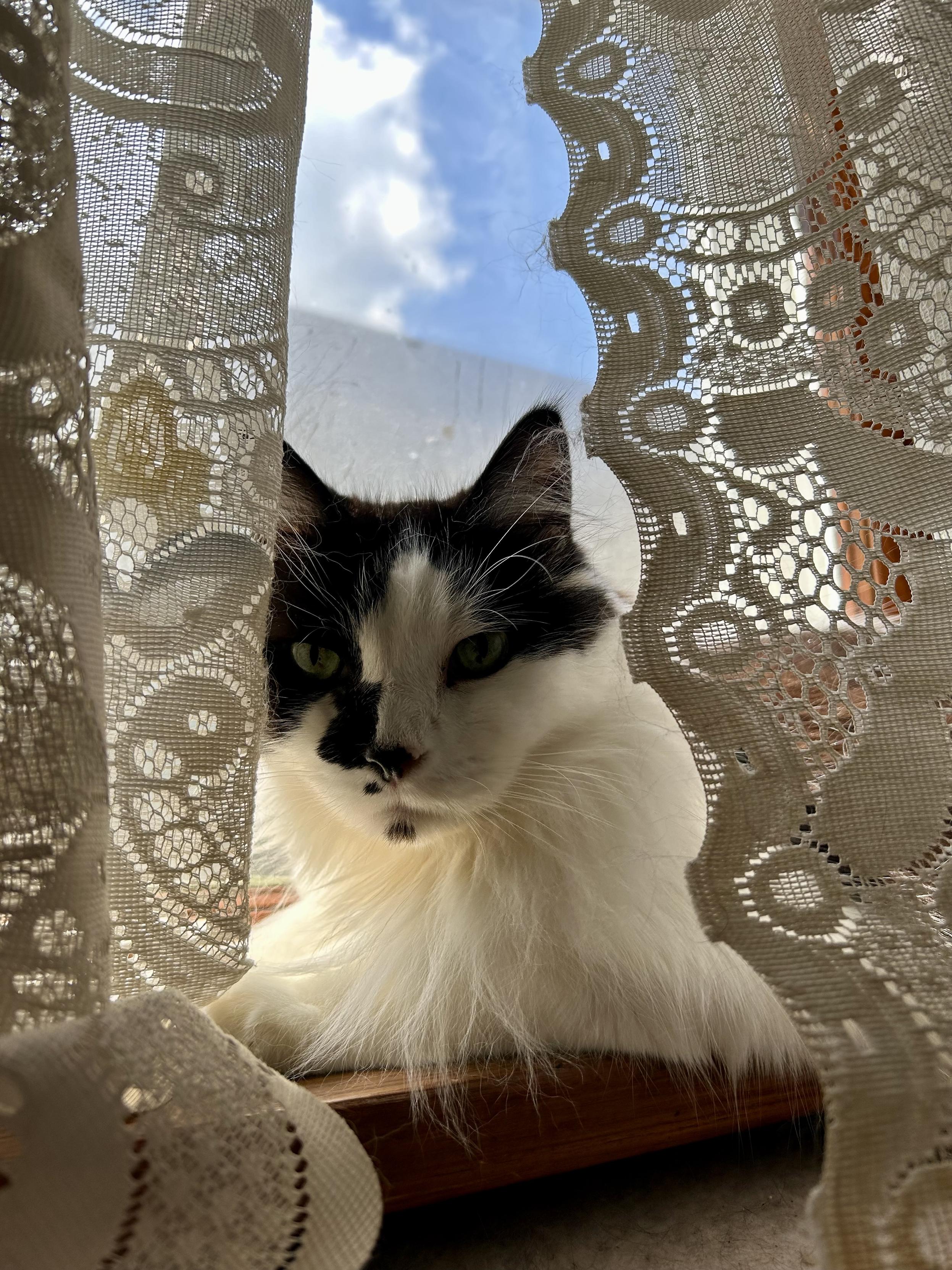 A black and white kitty lounging on a window sill behind lacy curtains. The sky is blue and cloudy through the window. His ruff is glowing with the sun.