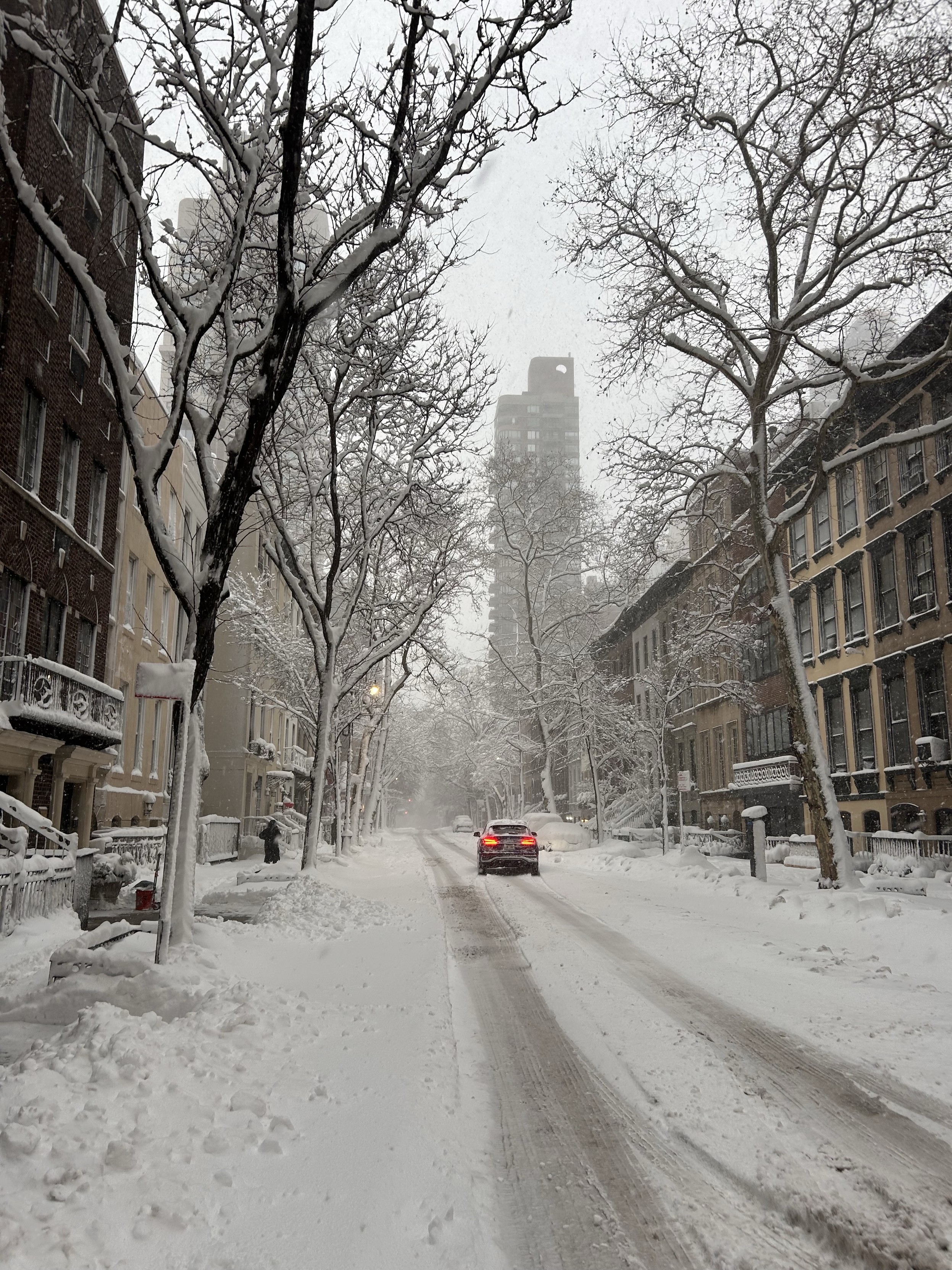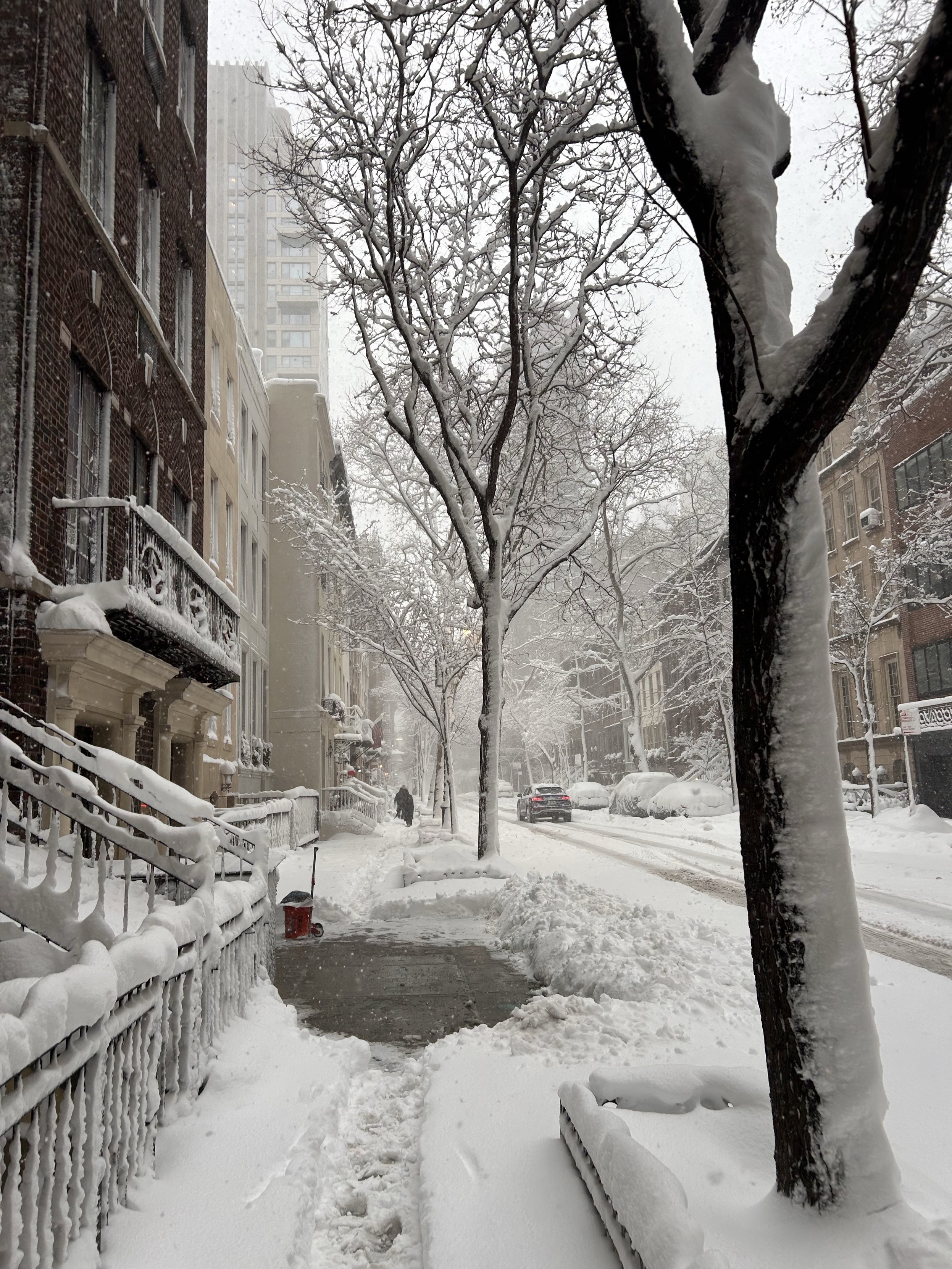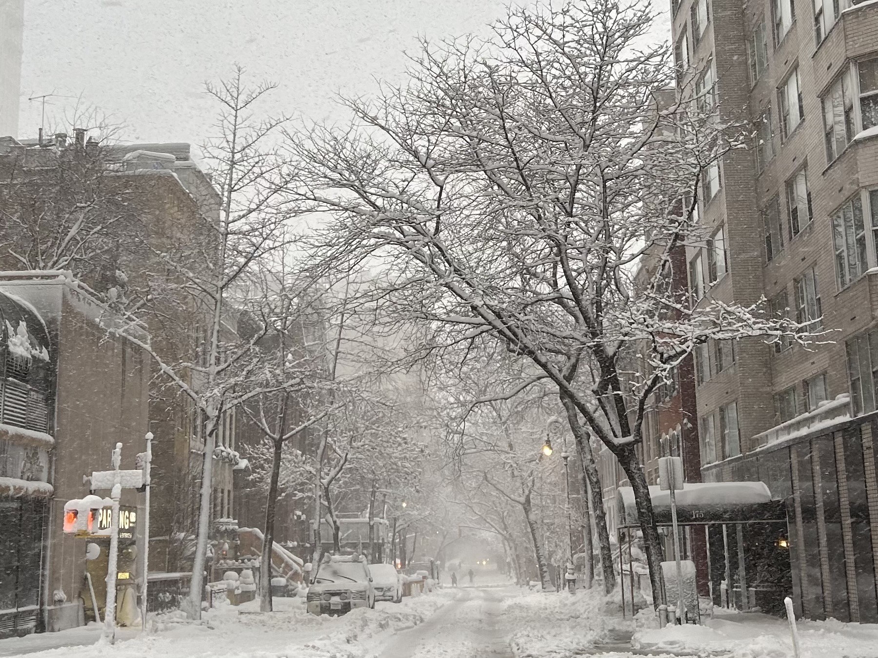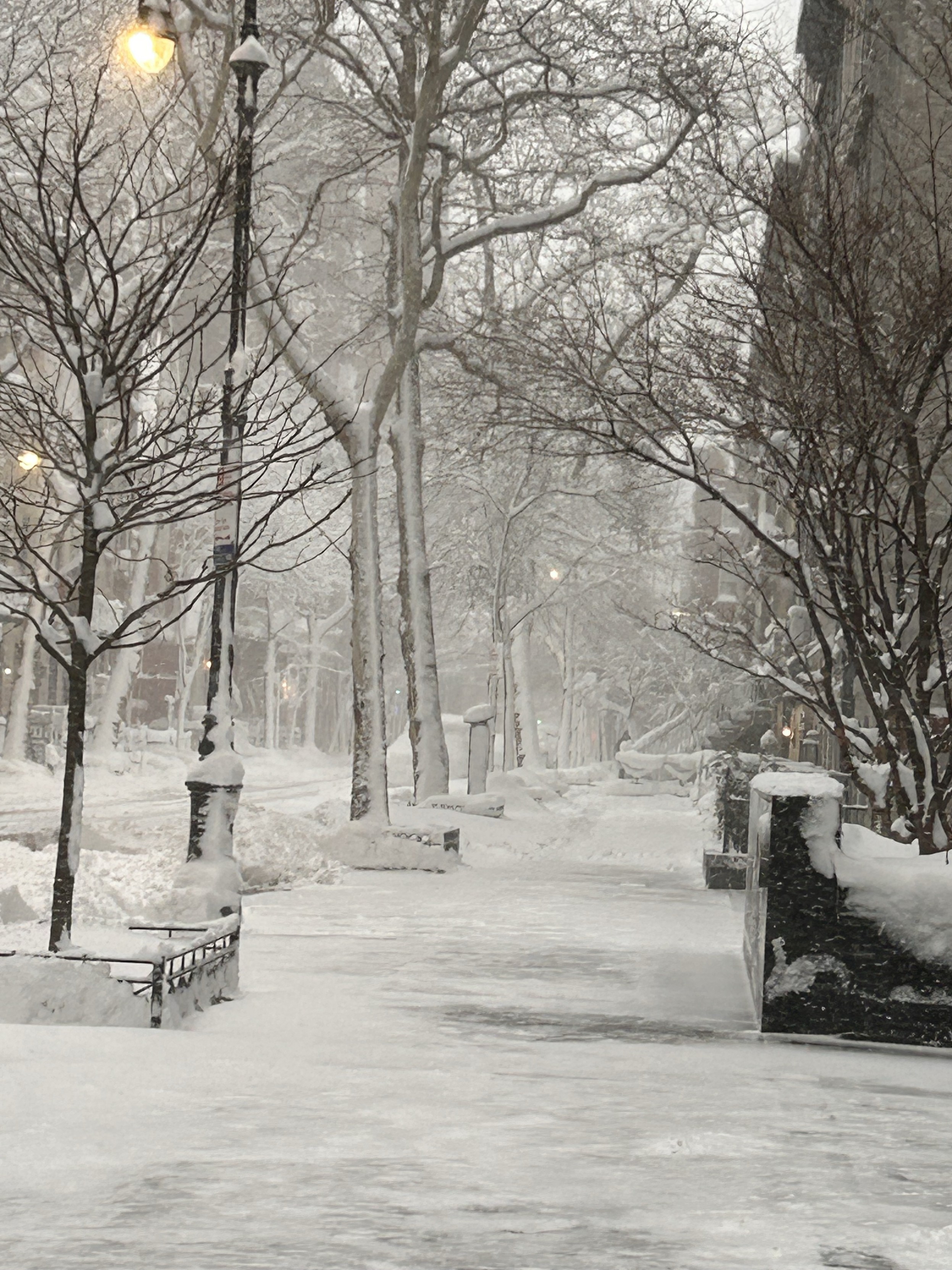 Black and white photo. Night on an empty street. A four-headed streetlight shines in a black sky, whirling snowflakes illuminated in its cone of light. Beyond it, a tree, its dark branches lined with snow. More streetlights in the distance. Another tree and the body of a shipping crane barely stand out against the dark. Closer to camera: a spiked fence, and a sidewalk and street dusted with snow (the first hint of much more to come). A fire hydrant flanked by bollard posts stands in dim light at the lower right of the image. The scene feels lonesome, desolate. With bated breath we brace for the storm.