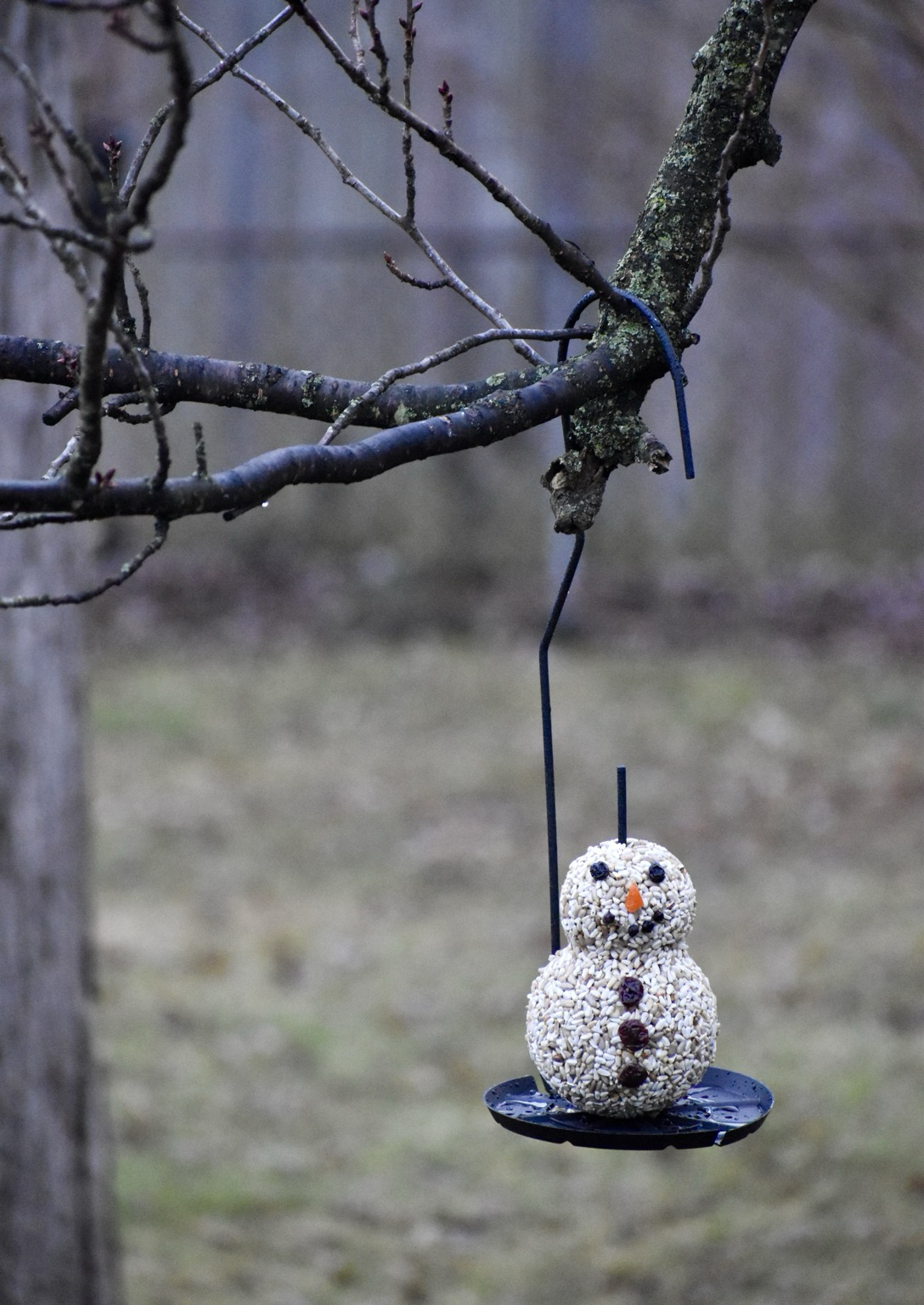 A small snowperson figure on a hook hangs from a winter-bare tree branch dotted with green lichen. It is made out of pale safflower birdseed with raisins for its eyes and mouth, and a triangular orange fruit nose.
