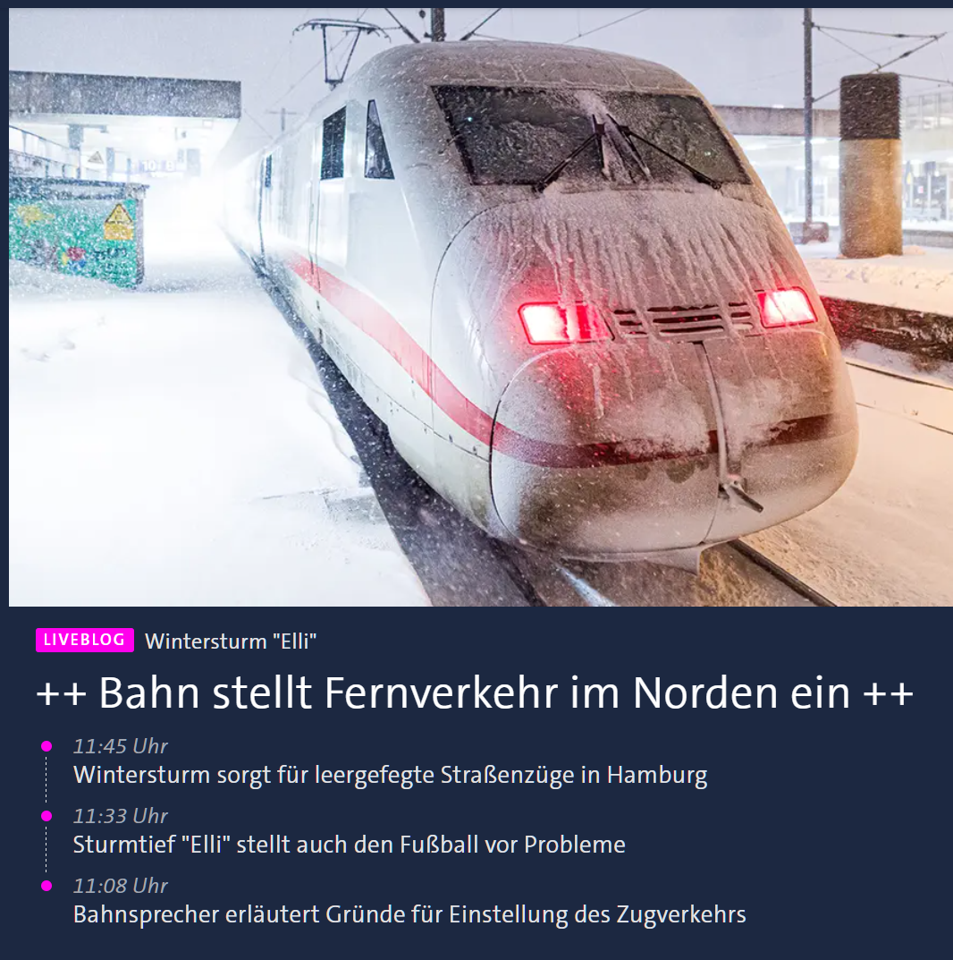 Sturmtief "Elli" zieht ab - Chaos bleibt: Die Bahn nimmt den Fernverkehr erst ab Mittag wieder auf, Metronom-Züge stehen weiter still. In Hannover, Osnabrück, Braunschweig und Bremen fahren keine Busse oder Straßenbahnen. ❄️