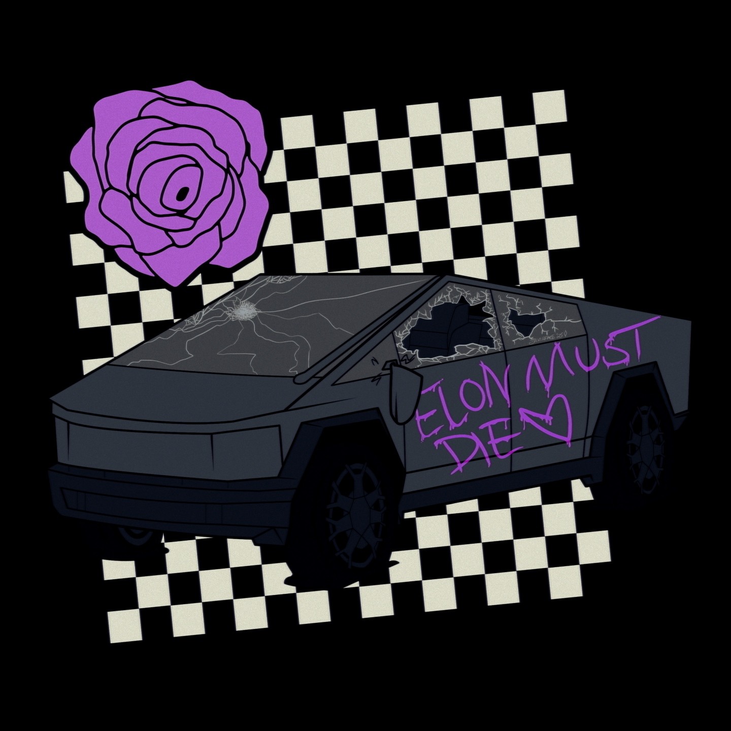 Digital art piece by Silverface (2025). It's a Cybertruck with its side windows smashed in, and the windshield has also been smashed on the top left by something large, causing large cracks all throughout the glass. The tires are also conspicuously flat. The drivers side doors have been spraypainted, in pink, with the following words:
