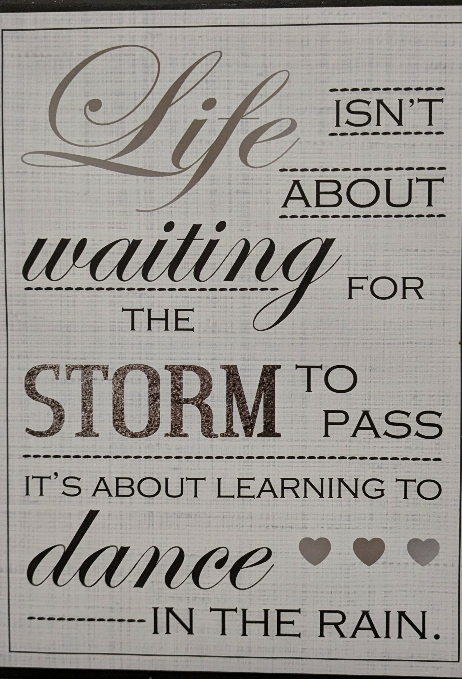 alt A plate showing the words: "Life isn't about waiting for the storm to pass. It's about learning to dance in the rain." A plate showing the words: "Life isn't about waiting for the storm to pass. It's about learning to dance in the rain."