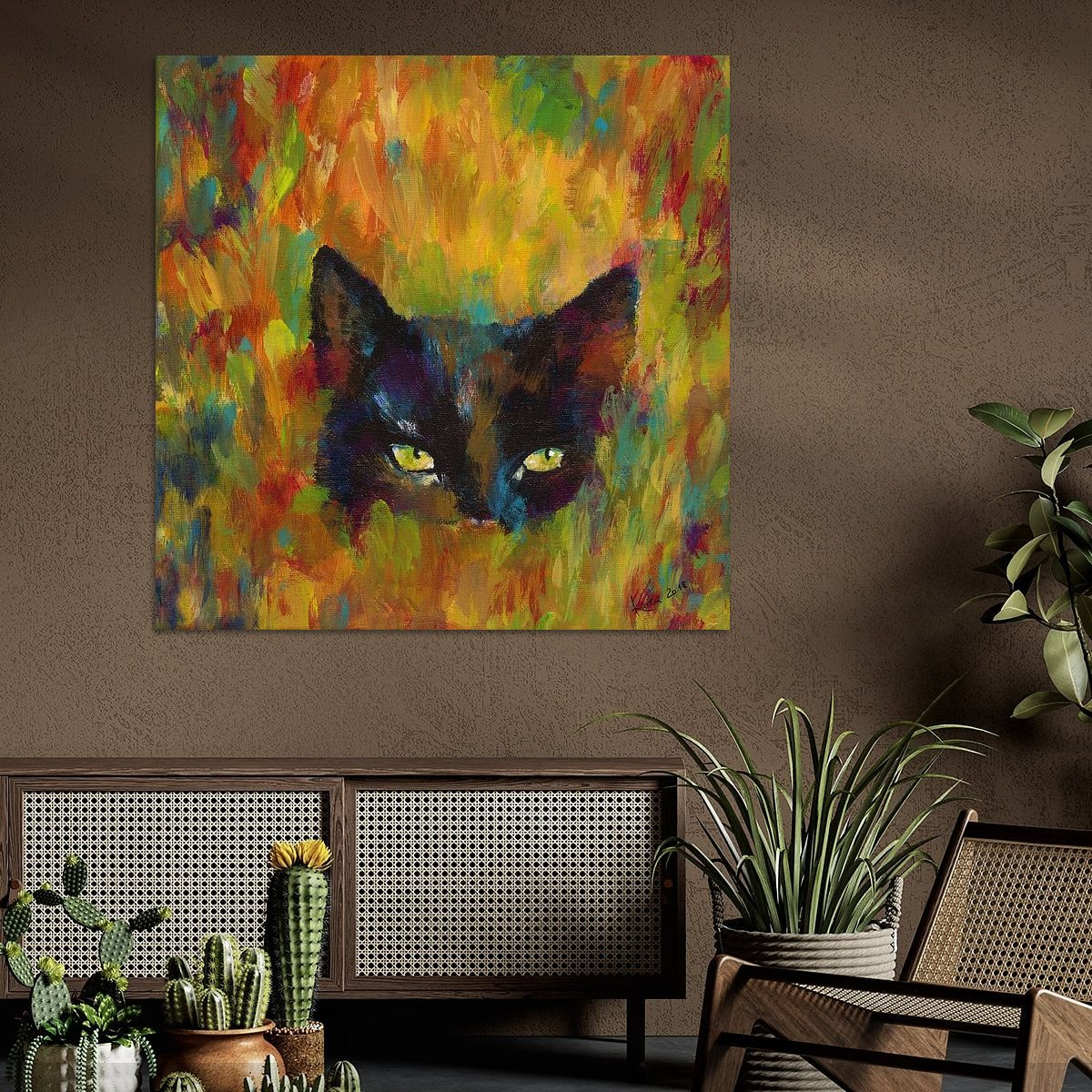 Black cat is an acrylic painting in contemporary square format painted by artist Karen Kaspar. A black cat is hiding in a meadow. You see the head of the black cat with green eyes. The background is painted with bold expressive brushstrokes in shades of green, yellow, orange and ocre.