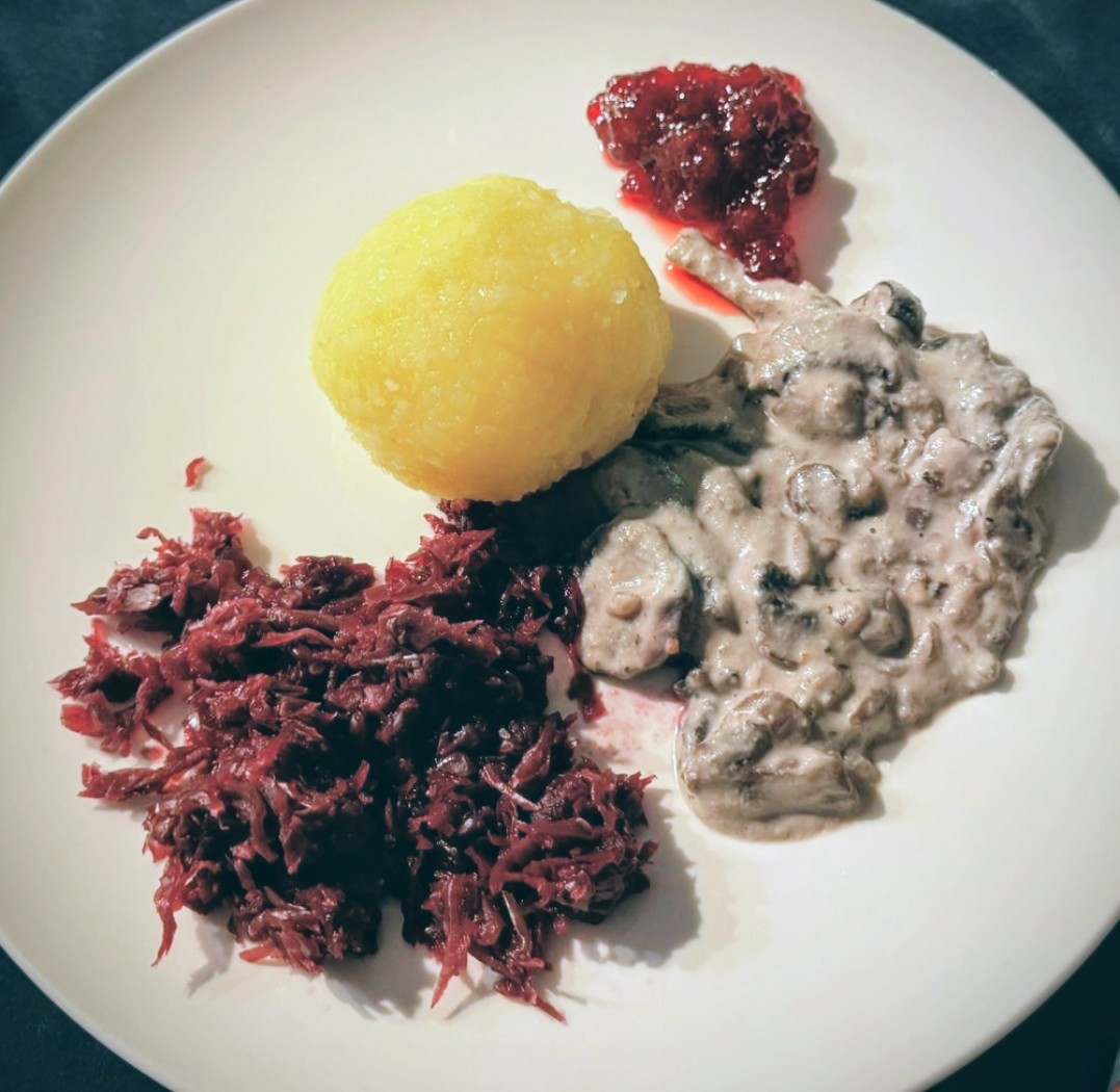 In der Mitte ein Teller mit Pommes, veganen Klößen mit Soße, Rotkohl und Birnenspalten mit Preiselbeeren.