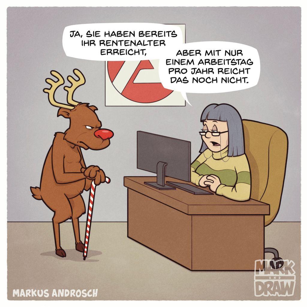 Cartoon: Der schon in die Jahre gekommene Rudolph, das Rentier, steht mit Gehstock vor dem Schreibtisch der Sachbearbeiterin des Arbeitsamtes. Rudolph möchte seine Rente beantragen. Die Sachbearbeiterin prüft ihren Computer und sagt: “JA, SIE HABEN BEREITS IHR RENTENALTER ERREICHT, ABER MIT NUR EINEM ARBEITSTAG PRO JAHR REICHT DAS NOCH NICHT.”
