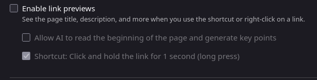 [Enable link previews See the page title, description, and more when you use the shortcut or right-click on a link. [0 Allow Al to read the beginning of the page and generate key points Bl shortcut: Click and hold the link for 1 second (long press)
