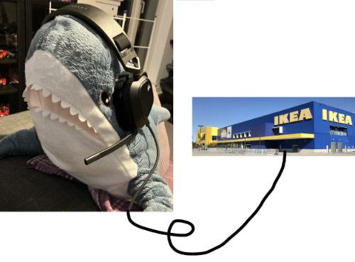 alt A Blåhaj cuddly shark wearing a headset. A cable from the headset runs to an Ikea store. A Blåhaj cuddly shark wearing a headset. A cable from the headset runs to an Ikea store.