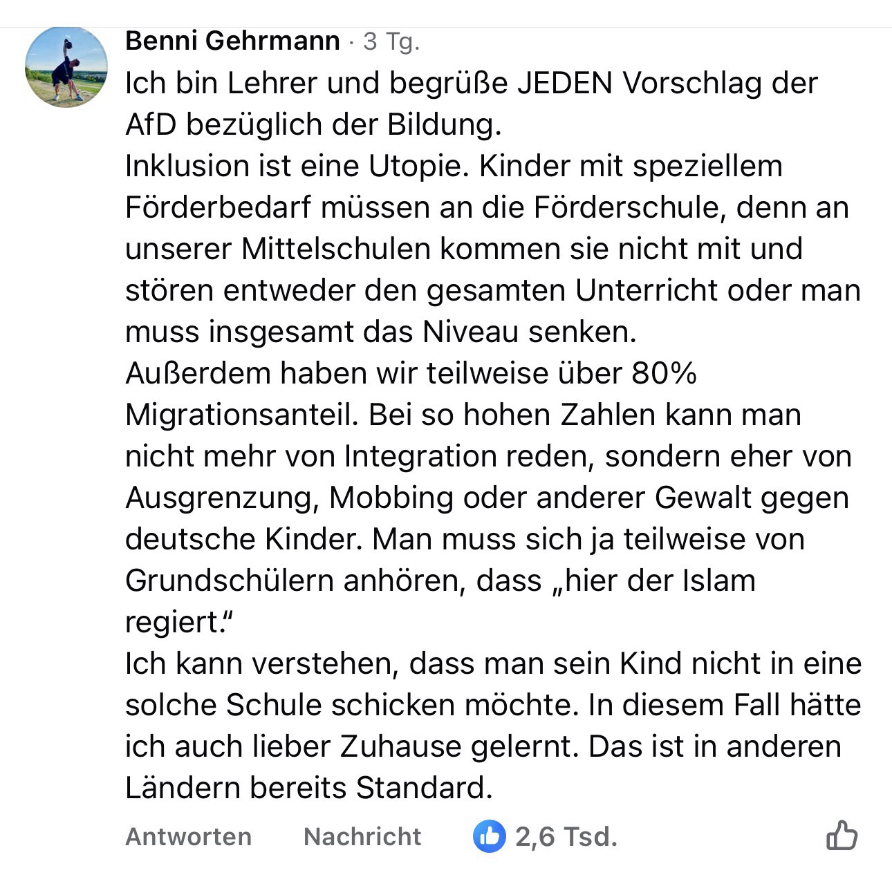 Schwierig finde ich ja, dass ich einige von den Punkten, die er da nennt, ähnlich beobachtet habe. Nur finde ich nicht, dass das ein Grund ist, die AfD zu wählen, denn die haben da auch keine sinnvolle Verbesserung für. Die liefe nämlich über mehr Geld, mehr Personal, mehr Zeit für Lehrkräfte, ihre Arbeit zu machen und weder über Ausgrenzung noch Abschiebung...