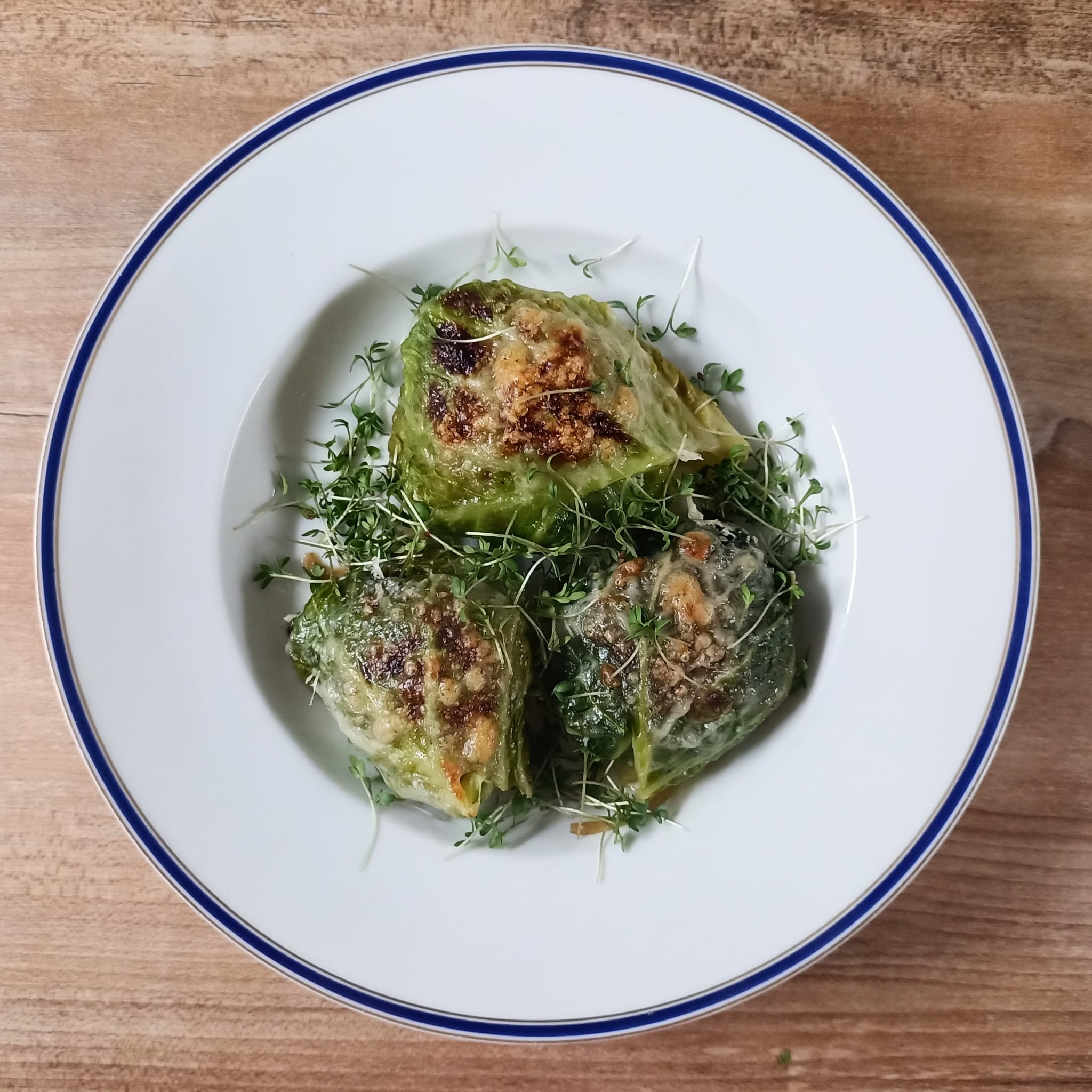 Zwiebel anbraten, mit #Gemüsebrühe ablöschen. Wirsingblätter füllen, in Brühe garen, zuletzt unter dem Grill mit Käse überbacken. Mit #Kresse bestreuen.