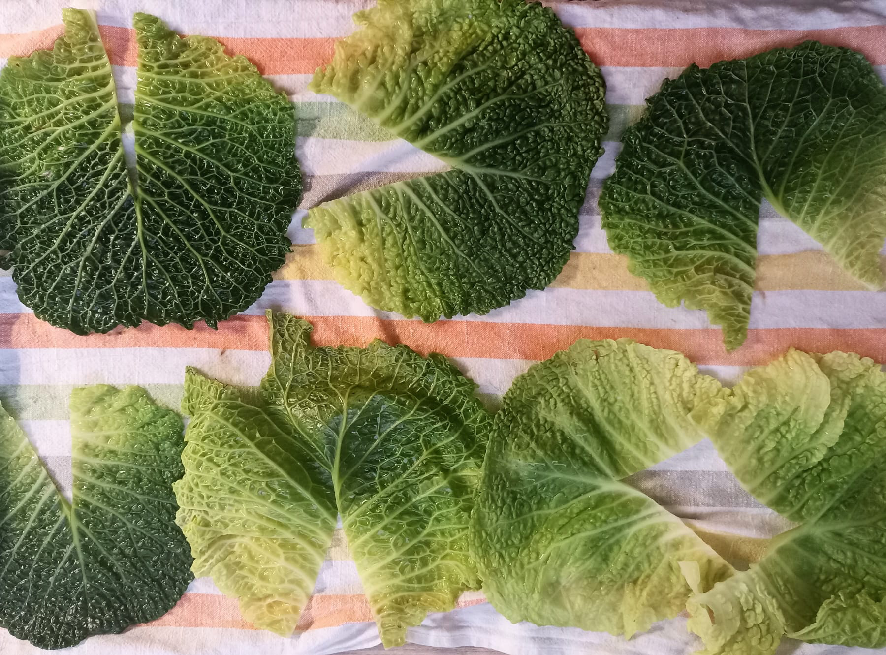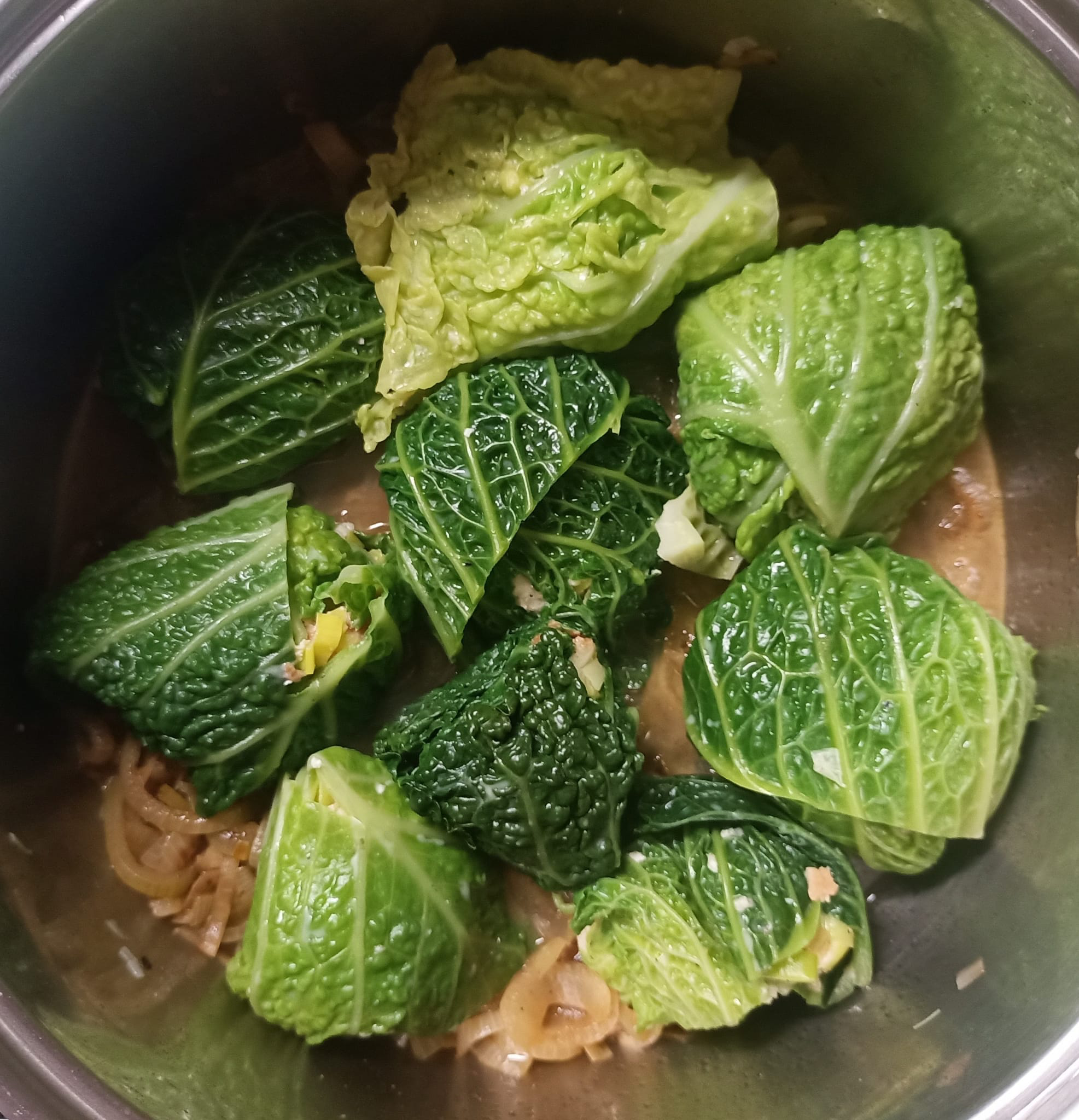 #Wirsing.blätter blanchieren, die dicke Rippe herausschneiden. #Weißbrot Würfel in Milch einweichen. #Porree + #Zwiebel schneiden, anbraten + zu den Brotwürfeln geben. Ei + geriebenen #Käse nach Belieben unterrühren, mit SalzPfeffer würzen.